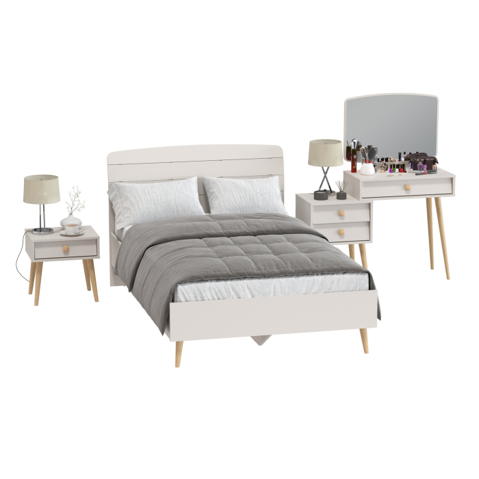 Комплектация включает кровать 1200 Афина 4-22905, туалетный столик с зеркалом Афина 4-25901 и тумбу прикроватную Афина 4-09901.