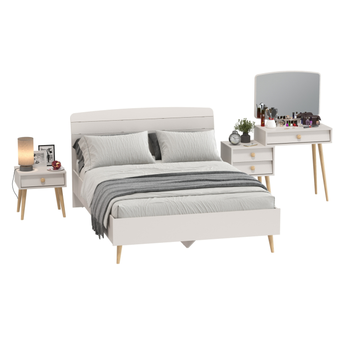 Комплектация включает кровать 1400 Афина 4-22911, туалетный столик с зеркалом Афина 4-25901 и тумбу прикроватную Афина 4-09901.
