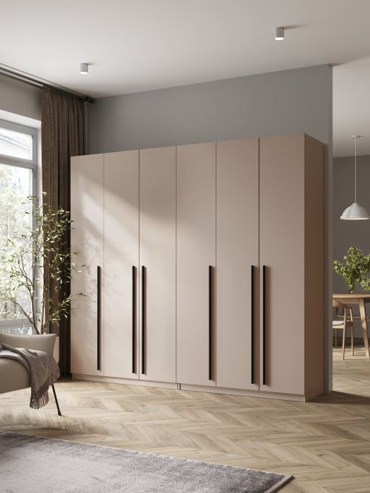 Шкаф отлично подойдет как для прихожей, так и для спальни, детской или гостиной. Он оборудован шестью дверцами, что обеспечивает удобный доступ к одежде и аксессуарам. Просторные отделения позволяют организовать хранение как верхней одежды, так и вещей, подходящих для более теплых сезонов. Вы можете без труда разместить здесь как платья, так и куртки, благодаря разнообразию внутренних полок и вешалок.