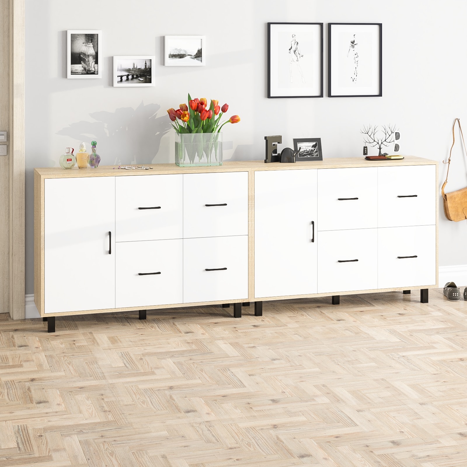 Каждый комод оснащен распашной дверкой с отделением с внутренней полкой, которая идеально подходит для хранения крупных вещей. С правой стороны расположены четыре выдвижных ящика, установленных в два ряда. Размер фасадов ящиков составляет (ШхВ) 386х365 мм. Все ящики оборудованы шариковыми направляющими длиной 350 мм, что обеспечивает плавное и тихое выдвижение. Обратите внимание, что комоды не имеют универсальной сборки - дверцы расположены только слева, а ящики – справа. Комоды установлены на прочные черные металлические опоры высотой 100 мм, которые придают конструкции легкость и устойчивость. Для удобства использования дверки и ящики открываются при помощи стильных металлических ручек длиной 128 мм черного цвета.