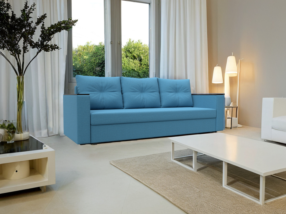 Прямой диван-кровать «Атланта» без стола — современная и функциональная модель станет уютным пространством для досуга. Три большие мягкие приспинные подушки обеспечат комфорт и удобство. Подлокотники с накладками могут выполнять функцию столика, на который всегда можно положить телефон и поставить чашечку чая. Механизм раскладки «еврокнижка» поможет превратить прямой диван в удобную кровать за считанные секунды. Нужно потянуть за нижнюю часть сиденья и опустить спинку в образовавшуюся нишу. Изделие дополнительно оборудовано вместительным ящиком для постельных принадлежностей. Крепкие пластиковые опоры отвечают за устойчивость дивана. За счет своей компактности он отлично впишется в обстановку детской комнаты или небольшой квартиры-студии.