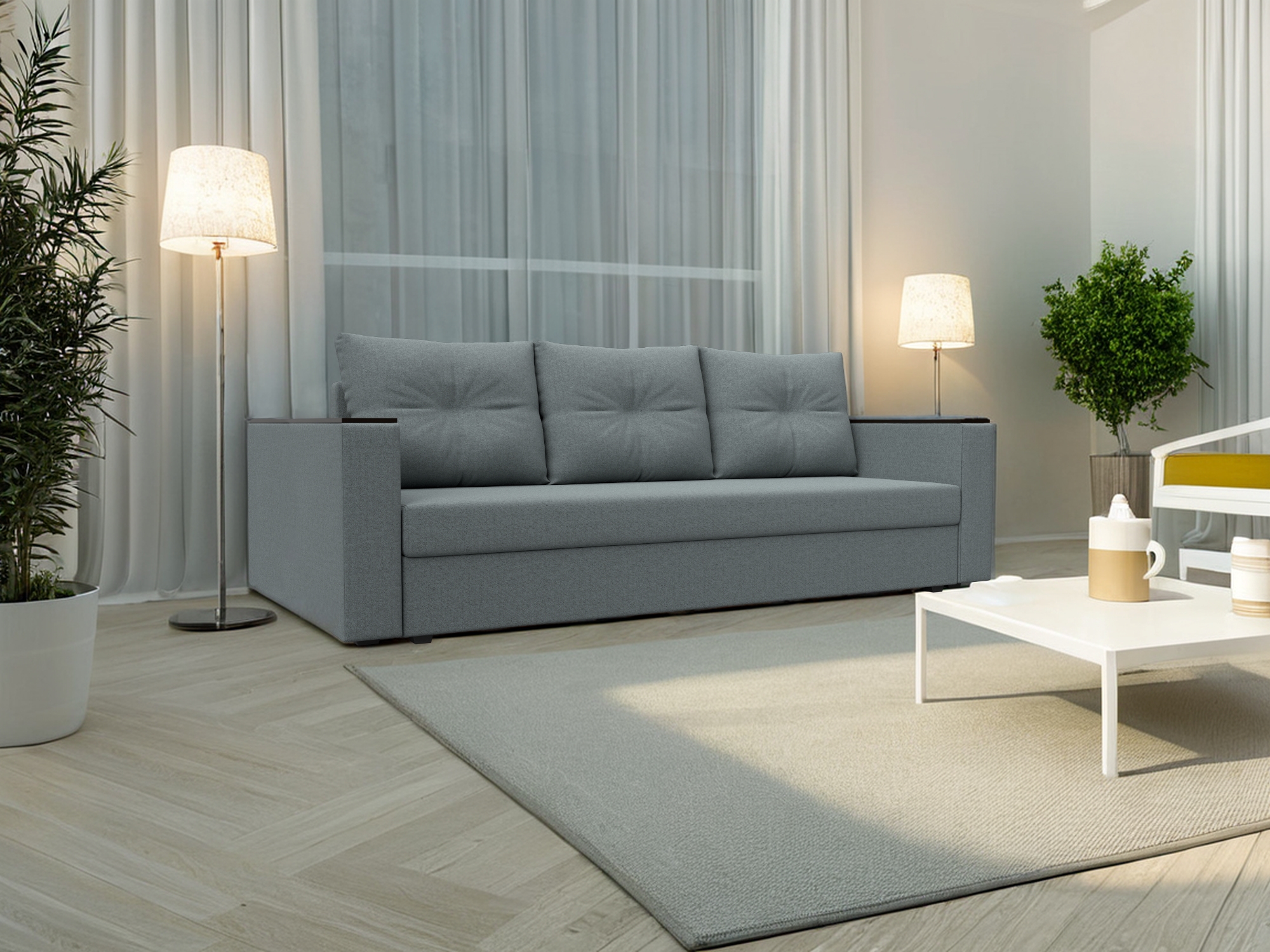 Прямой диван-кровать «Атланта» без стола — современная и функциональная модель станет уютным пространством для досуга. Три большие мягкие приспинные подушки обеспечат комфорт и удобство. Подлокотники с накладками могут выполнять функцию столика, на который всегда можно положить телефон и поставить чашечку чая. Механизм раскладки «еврокнижка» поможет превратить прямой диван в удобную кровать за считанные секунды. Нужно потянуть за нижнюю часть сиденья и опустить спинку в образовавшуюся нишу. Изделие дополнительно оборудовано вместительным ящиком для постельных принадлежностей. Крепкие пластиковые опоры отвечают за устойчивость дивана. За счет своей компактности он отлично впишется в обстановку детской комнаты или небольшой квартиры-студии.