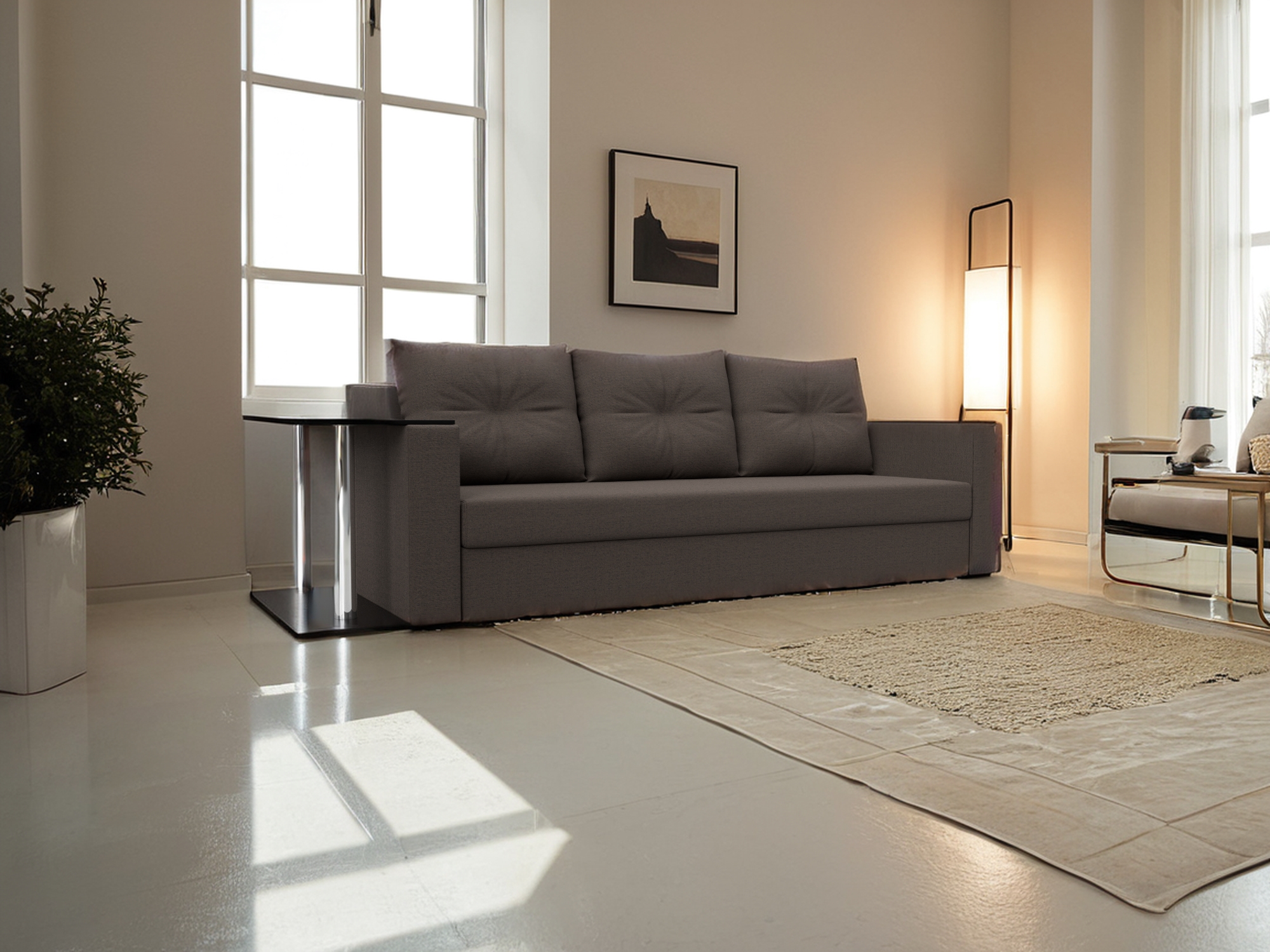 : диван с подобным механизмом занимает совсем мало места, может стоять как у стены, так и в середине комнаты;