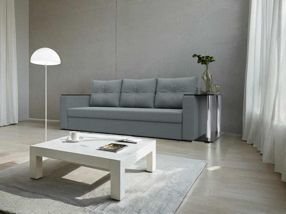 Диван-кровать «Атланта» со столом - просторное и уютное пространство, созданное для общения, просмотра ТВ и просто отдыха. Выбирая модель со столиком, вы сможете проводить время с максимальным комфортом, многократно повысив функциональность дивана. Поверхность столика — идеальное пространство для чаепития в приятной компании, а также место для множества актуальных мелочей — от ноутбука до косметики. В разложенном виде диван образует комфортное спальное место. Механизм раскладки «еврокнижка» поможет превратить прямой диван в удобную кровать за считанные секунды. Нужно потянуть за нижнюю часть сиденья и опустить спинку в образовавшуюся нишу. Изделие дополнительно оборудовано вместительным ящиком для постельных принадлежностей. Компактность и доминанта прямых линий впишут диван в большинство городских квартир.