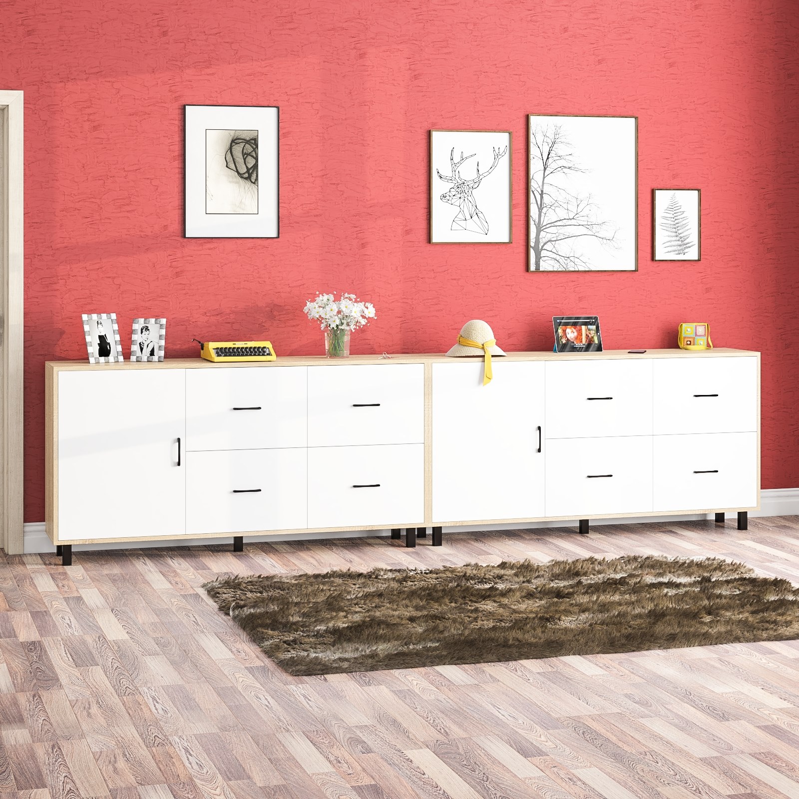 Каждый комод оснащен распашной дверкой (размеры створки (ШхВ) 533х732 мм) с отделением с внутренней полкой, которая идеально подходит для хранения крупных вещей. С правой стороны расположены четыре выдвижных ящика, установленных в два ряда. Размер фасадов ящиков составляет (ШхВ) 533х365 мм. Все ящики оборудованы шариковыми направляющими длиной 350 мм, что обеспечивает плавное и тихое выдвижение. Обратите внимание, что комоды не имеют универсальной сборки - дверцы расположены только слева, а ящики – справа. Комоды установлены на прочные черные металлические опоры высотой 100 мм, которые придают конструкции легкость и устойчивость. Для удобства использования дверки и ящики открываются при помощи стильных металлических ручек длиной 128 мм черного цвета.