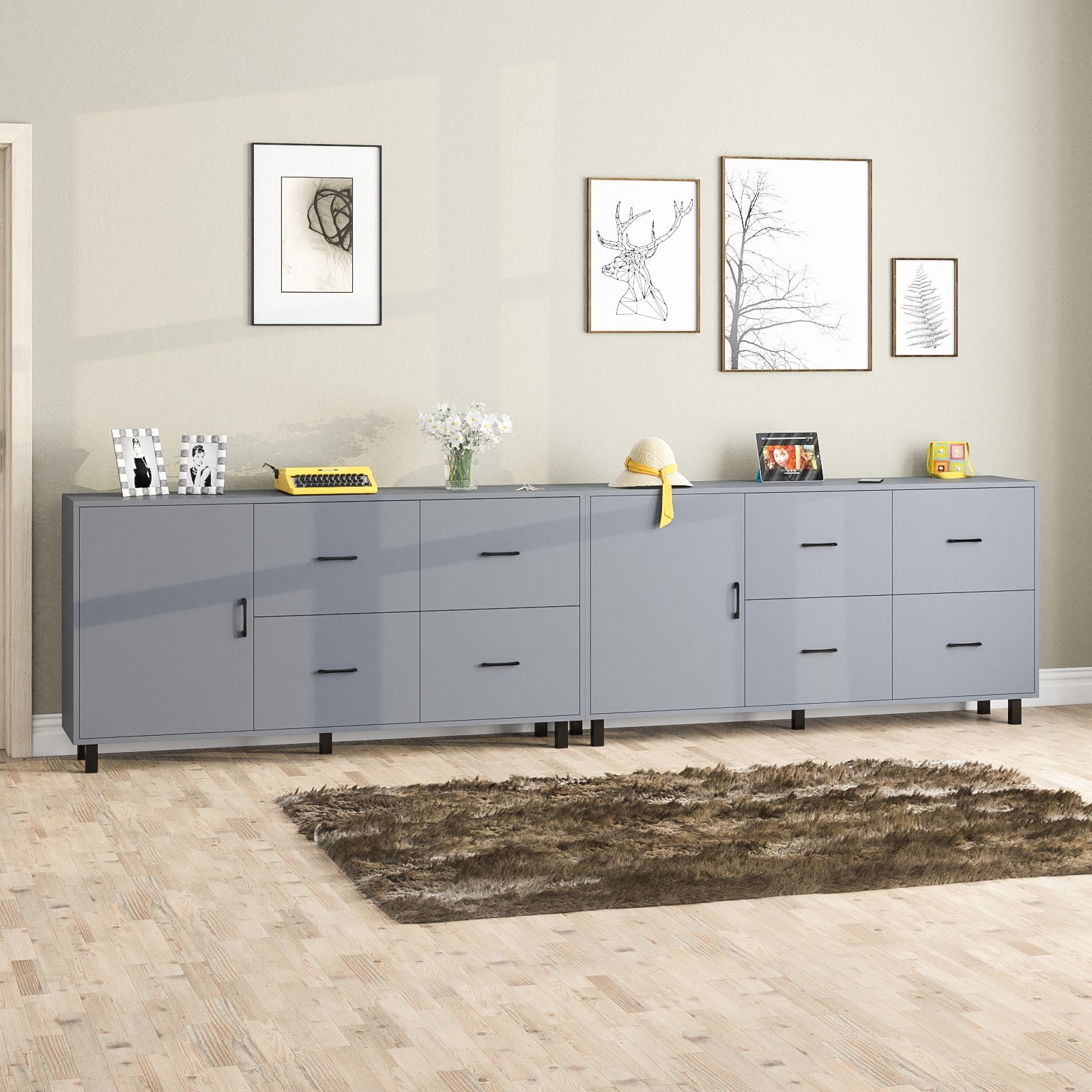 Каждый комод оснащен распашной дверкой (размеры створки (ШхВ) 533х732 мм) с отделением с внутренней полкой, которая идеально подходит для хранения крупных вещей. С правой стороны расположены четыре выдвижных ящика, установленных в два ряда. Размер фасадов ящиков составляет (ШхВ) 533х365 мм. Все ящики оборудованы шариковыми направляющими длиной 350 мм, что обеспечивает плавное и тихое выдвижение. Обратите внимание, что комоды не имеют универсальной сборки - дверцы расположены только слева, а ящики – справа. Комоды установлены на прочные черные металлические опоры высотой 100 мм, которые придают конструкции легкость и устойчивость. Для удобства использования дверки и ящики открываются при помощи стильных металлических ручек длиной 128 мм черного цвета.