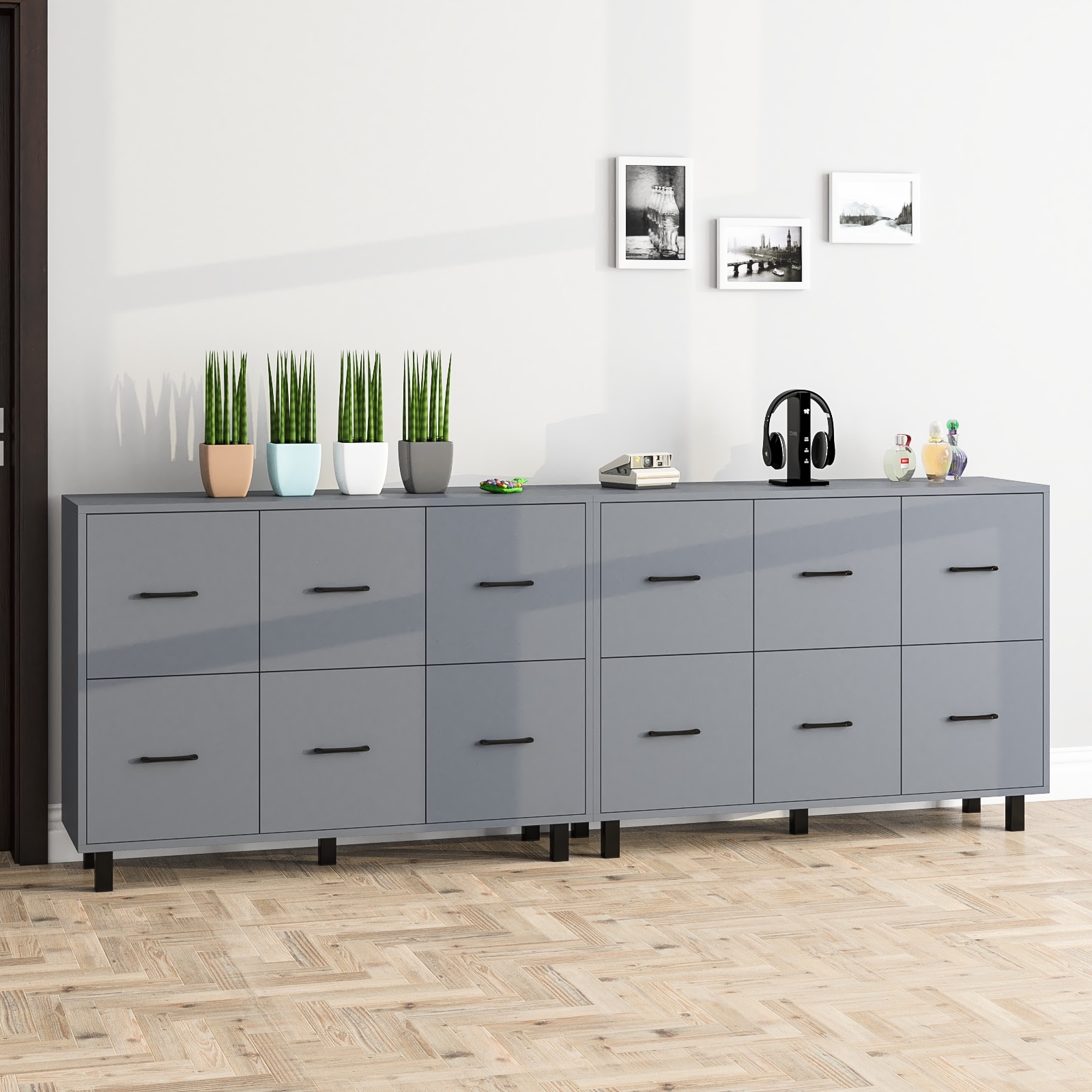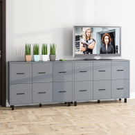 Каждый комод оборудован шестью одинаковыми выдвижными ящиками, расположенными в два ряда (по три сверху и три снизу). Размер фасадов ящиков – 365х386 мм, ящики снабжены шариковыми направляющими длиной 350 мм, которые обеспечивают мягкое и надежное открывание. Комоды установлены на десять металлических опор черного цвета высотой 100 мм, придающих конструкции устойчивость и легкость. Металлические ручки длиной 128 мм в минималистичном стиле добавляют комодам изысканности и практичности.