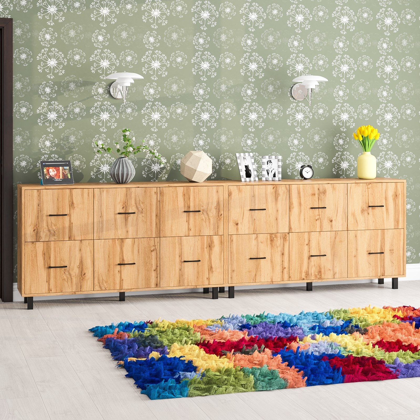 Каждый комод-тумба оборудован шестью одинаковыми выдвижными ящиками, расположенными в два ряда (по три сверху и три снизу). Размер фасадов ящиков – 365х486 мм, ящики снабжены шариковыми направляющими длиной 350 мм, которые обеспечивают мягкое и надежное открывание. Комоды установлены на десять металлических опор черного цвета высотой 100 мм, придающих конструкции устойчивость и легкость. Металлические ручки длиной 128 мм в минималистичном стиле добавляют комодам изысканности и практичности.
