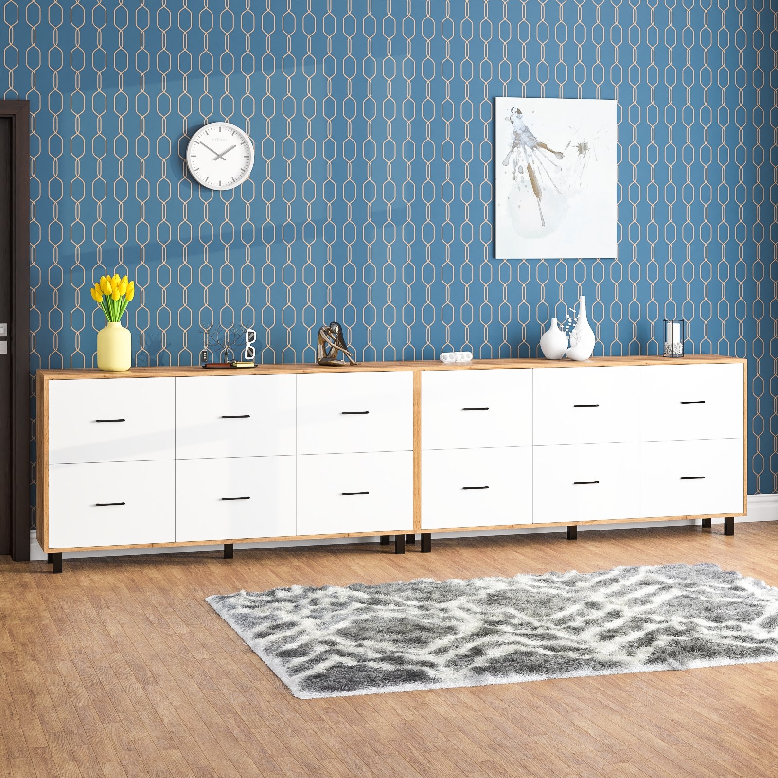 Каждый комод оборудован шестью одинаковыми выдвижными ящиками, расположенными в два ряда (по три сверху и три снизу). Размер фасадов ящиков – 365х552 мм, ящики снабжены шариковыми направляющими длиной 350 мм, которые обеспечивают мягкое и надежное открывание. Комоды установлены на десять металлических опор черного цвета высотой 100 мм, придающих конструкции устойчивость и легкость. Металлические ручки длиной 128 мм в минималистичном стиле добавляют комодам изысканности и практичности.