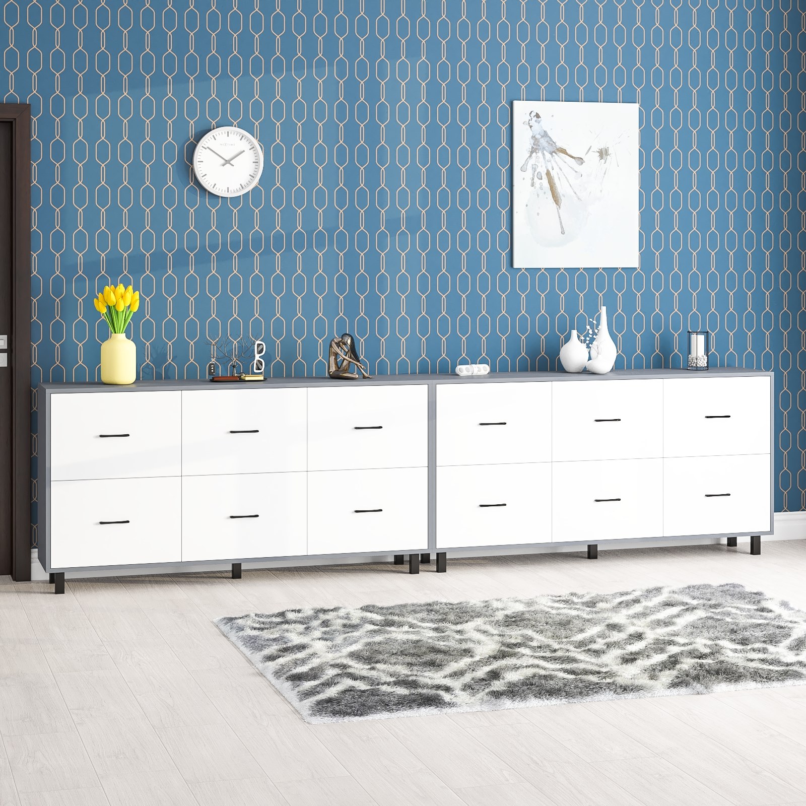 Каждый комод оборудован шестью одинаковыми выдвижными ящиками, расположенными в два ряда (по три сверху и три снизу). Размер фасадов ящиков – 365х552 мм, ящики снабжены шариковыми направляющими длиной 350 мм, которые обеспечивают мягкое и надежное открывание. Комоды установлены на десять металлических опор черного цвета высотой 100 мм, придающих конструкции устойчивость и легкость. Металлические ручки длиной 128 мм в минималистичном стиле добавляют комодам изысканности и практичности.