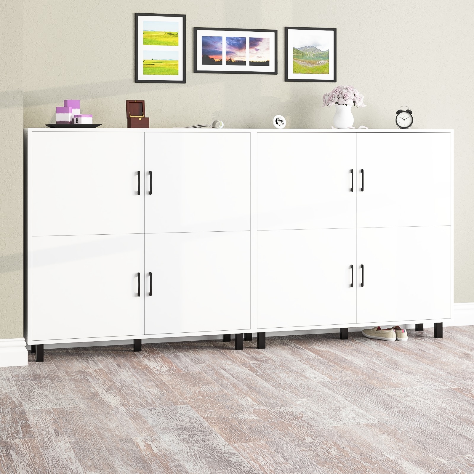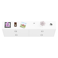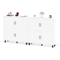 Каждая тумба оборудована четырьмя распашными дверками, расположенными в два ряда (по две в каждом). Размеры створок составляют 530х580 мм. За каждой парой дверок расположено просторное отделение с полкой по центру, которое позволяет эффективно организовать хранение. Тумбы установлены на десять устойчивых металлических опор черного цвета высотой 100 мм, что придает конструкции легкость и современный вид. Створки открываются с помощью металлических ручек длиной 128 мм, выполненных в минималистичном стиле.