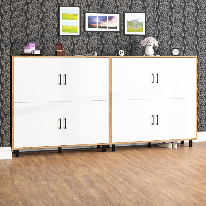 Каждая тумба оборудована четырьмя распашными дверками, расположенными в два ряда (по две в каждом). Размеры створок составляют 530х580 мм. За каждой парой дверок расположено просторное отделение с полкой по центру, которое позволяет эффективно организовать хранение. Тумбы установлены на десять устойчивых металлических опор черного цвета высотой 100 мм, что придает конструкции легкость и современный вид. Створки открываются с помощью металлических ручек длиной 128 мм, выполненных в минималистичном стиле.