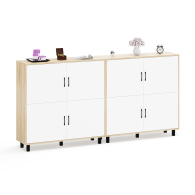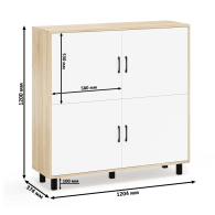 Каждая тумба оборудована четырьмя распашными дверками, расположенными в два ряда (по две в каждом). Размеры створок составляют 530х580 мм. За каждой парой дверок расположено просторное отделение с полкой по центру, которое позволяет эффективно организовать хранение. Тумбы установлены на десять устойчивых металлических опор черного цвета высотой 100 мм, что придает конструкции легкость и современный вид. Створки открываются с помощью металлических ручек длиной 128 мм, выполненных в минималистичном стиле.