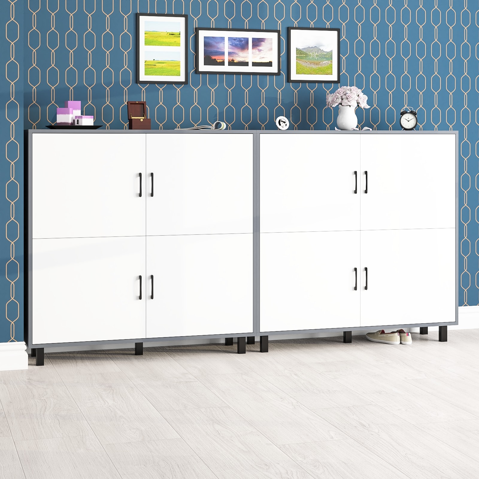 Каждая тумба оборудована четырьмя распашными дверками, расположенными в два ряда (по две в каждом). Размеры створок составляют 530х580 мм. За каждой парой дверок расположено просторное отделение с полкой по центру, которое позволяет эффективно организовать хранение. Тумбы установлены на десять устойчивых металлических опор черного цвета высотой 100 мм, что придает конструкции легкость и современный вид. Створки открываются с помощью металлических ручек длиной 128 мм, выполненных в минималистичном стиле.