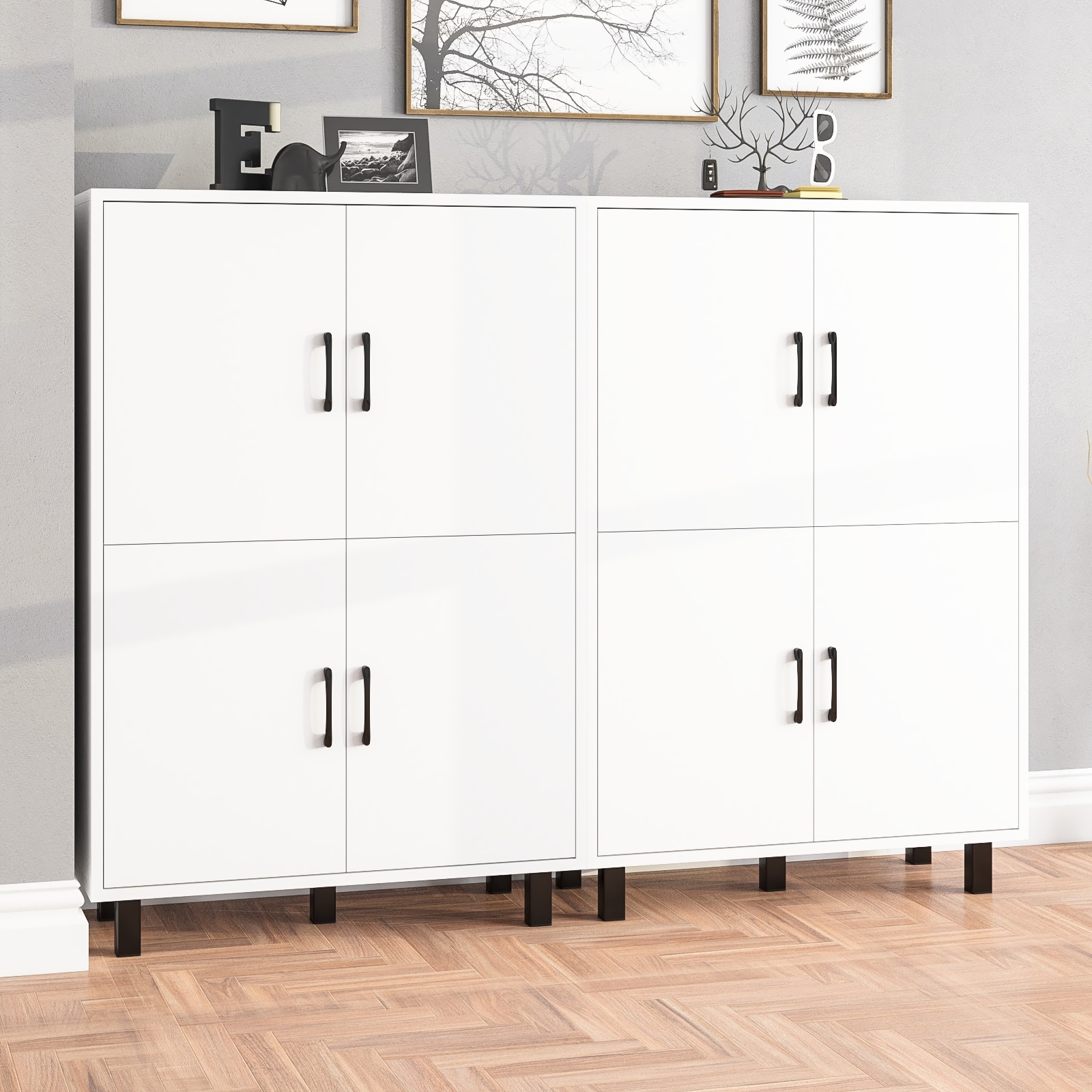 Каждая тумба оборудована четырьмя распашными дверками, расположенными в два ряда (по две в каждом). Размеры створок составляют 530х380 мм. За каждой парой дверок расположено просторное отделение с полкой по центру, которое позволяет эффективно организовать хранение. Тумбы установлены на десять устойчивых металлических опор черного цвета высотой 100 мм, что придает конструкции легкость и современный вид. Створки открываются с помощью металлических ручек длиной 128 мм, выполненных в минималистичном стиле.