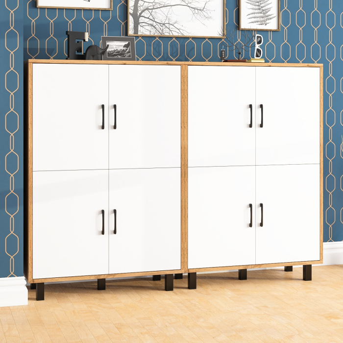 Каждая тумба оборудована четырьмя распашными дверками, расположенными в два ряда (по две в каждом). Размеры створок составляют 530х380 мм. За каждой парой дверок расположено просторное отделение с полкой по центру, которое позволяет эффективно организовать хранение. Тумбы установлены на десять устойчивых металлических опор черного цвета высотой 100 мм, что придает конструкции легкость и современный вид. Створки открываются с помощью металлических ручек длиной 128 мм, выполненных в минималистичном стиле.