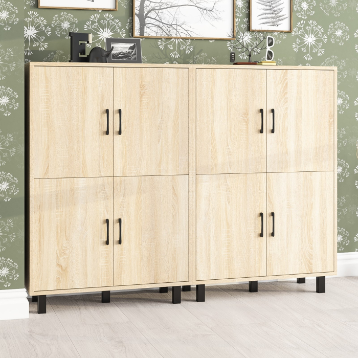 Каждая тумба оборудована четырьмя распашными дверками, расположенными в два ряда (по две в каждом). Размеры створок составляют 530х380 мм. За каждой парой дверок расположено просторное отделение с полкой по центру, которое позволяет эффективно организовать хранение. Тумбы установлены на десять устойчивых металлических опор черного цвета высотой 100 мм, что придает конструкции легкость и современный вид. Створки открываются с помощью металлических ручек длиной 128 мм, выполненных в минималистичном стиле.