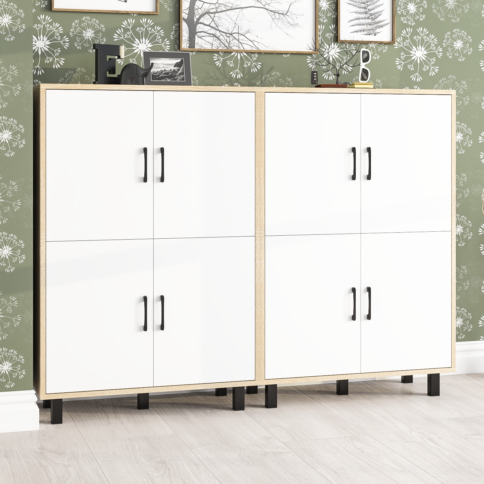 Каждая тумба оборудована четырьмя распашными дверками, расположенными в два ряда (по две в каждом). Размеры створок составляют 530х380 мм. За каждой парой дверок расположено просторное отделение с полкой по центру, которое позволяет эффективно организовать хранение. Тумбы установлены на десять устойчивых металлических опор черного цвета высотой 100 мм, что придает конструкции легкость и современный вид. Створки открываются с помощью металлических ручек длиной 128 мм, выполненных в минималистичном стиле.