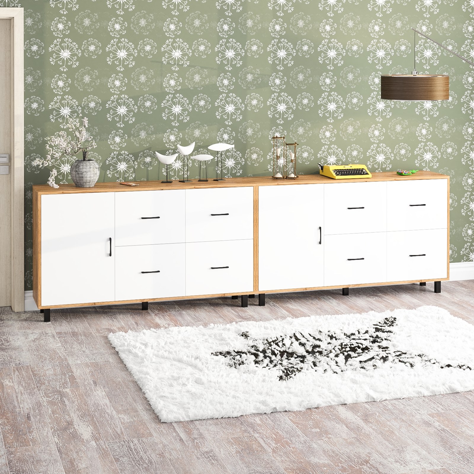 Каждый комод-тумба оснащен распашной дверкой (размеры створки (ШхВ) 486х732 мм) с отделением с внутренней полкой, которая идеально подходит для хранения крупных вещей. С правой стороны расположены четыре выдвижных ящика, установленных в два ряда. Размер фасадов ящиков составляет (ШхВ) 486х365 мм. Все ящики оборудованы шариковыми направляющими длиной 350 мм, что обеспечивает плавное и тихое выдвижение. Обратите внимание, что комоды-тумбы не имеют универсальной сборки - дверцы расположены только слева, а ящики – справа. Комоды-тумбы установлены на прочные черные металлические опоры высотой 100 мм, которые придают конструкции легкость и устойчивость. Для удобства использования дверки и ящики открываются при помощи стильных металлических ручек длиной 128 мм черного цвета.