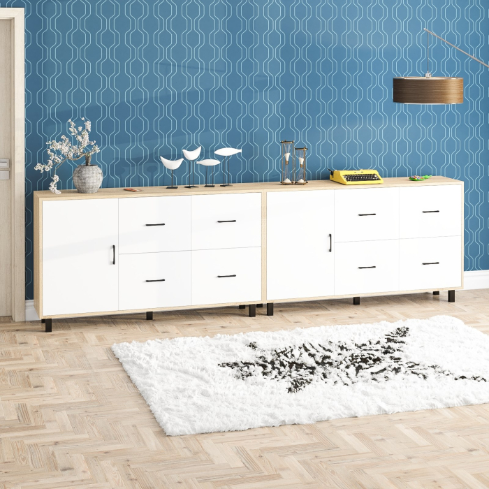 Каждый комод-тумба оснащен распашной дверкой (размеры створки (ШхВ) 486х732 мм) с отделением с внутренней полкой, которая идеально подходит для хранения крупных вещей. С правой стороны расположены четыре выдвижных ящика, установленных в два ряда. Размер фасадов ящиков составляет (ШхВ) 486х365 мм. Все ящики оборудованы шариковыми направляющими длиной 350 мм, что обеспечивает плавное и тихое выдвижение. Обратите внимание, что комоды-тумбы не имеют универсальной сборки - дверцы расположены только слева, а ящики – справа. Комоды-тумбы установлены на прочные черные металлические опоры высотой 100 мм, которые придают конструкции легкость и устойчивость. Для удобства использования дверки и ящики открываются при помощи стильных металлических ручек длиной 128 мм черного цвета.