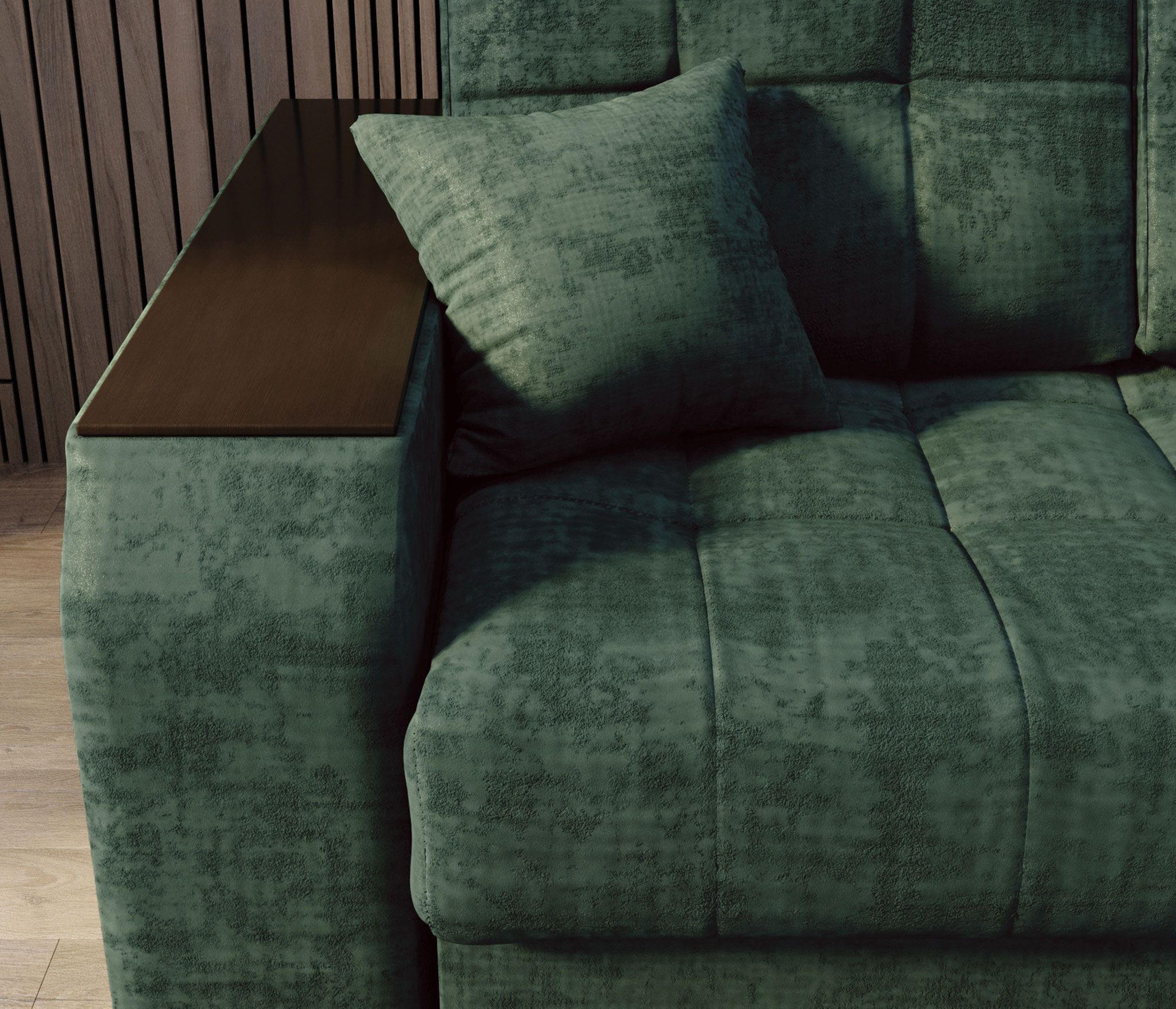 Оттоманка имеет оригинальную Г-образную форму, обтекающую подлокотник спереди. Это придаёт дивану изысканный вид и, когда диван установлен подлокотником к стене, отсутствует щель между оттоманкой и стеной, что удлиняет спальное место.Под декорами в подлокотниках скрыты два вместительных короба. В них можно хранить как постельное бельё, так и множество вещей, которым иногда сложно найти место, например, игрушки и даже инструменты. Мягкие приспинные подушки создают дополнительный комфорт во время сидения.Декоративные подушки при желании можно подложить под спину или голову. Задняя планка придаёт жёсткость конструкции и ограничивает соприкосновение со стеной во время сна.Благодаря утяжкам на сидении дивана ткань не растягивается и не собирается в складки.