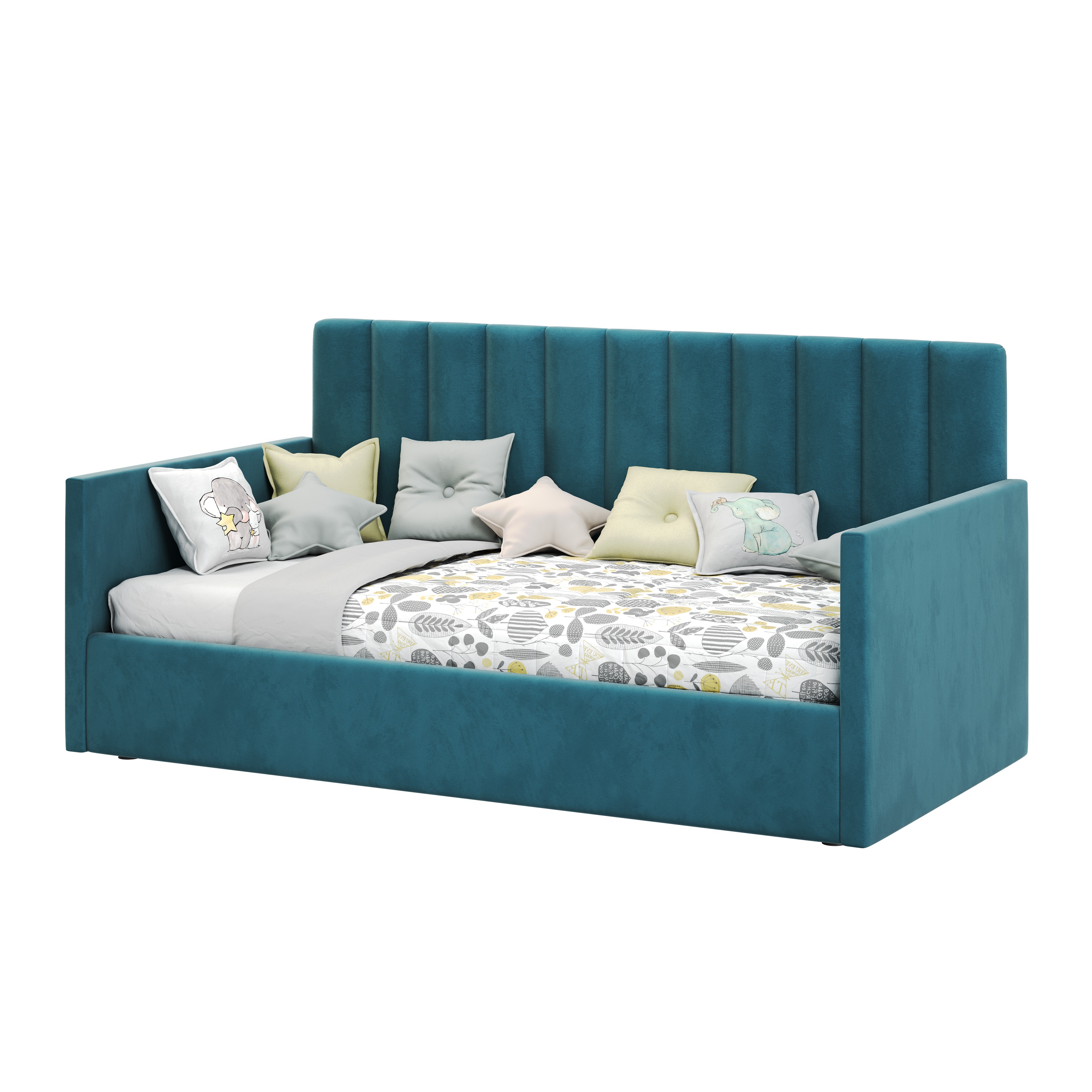 Кровать изготовлена из ЛДСП, что гарантирует прочность и долговечность конструкции. Обивка из велюра искусственного цвета (бирюзовый) приятна на ощупь и проста в уходе.