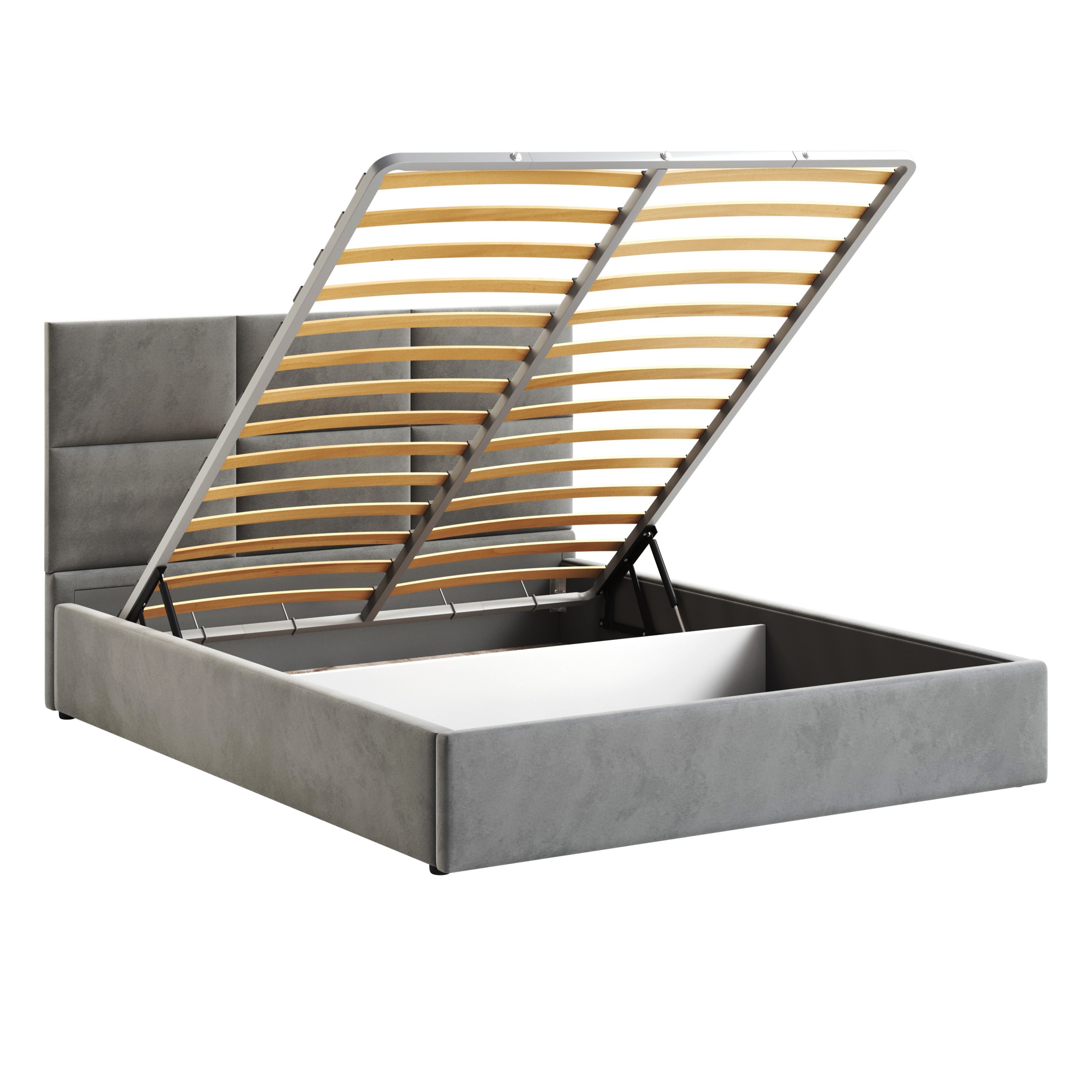 Кровать оснащена подъемным механизмом на газ/лифтах и вместительным бельевым ящиком, что обеспечивает дополнительное пространство для хранения постельного белья и других вещей. Это позволяет экономить место в спальне и поддерживать порядок.