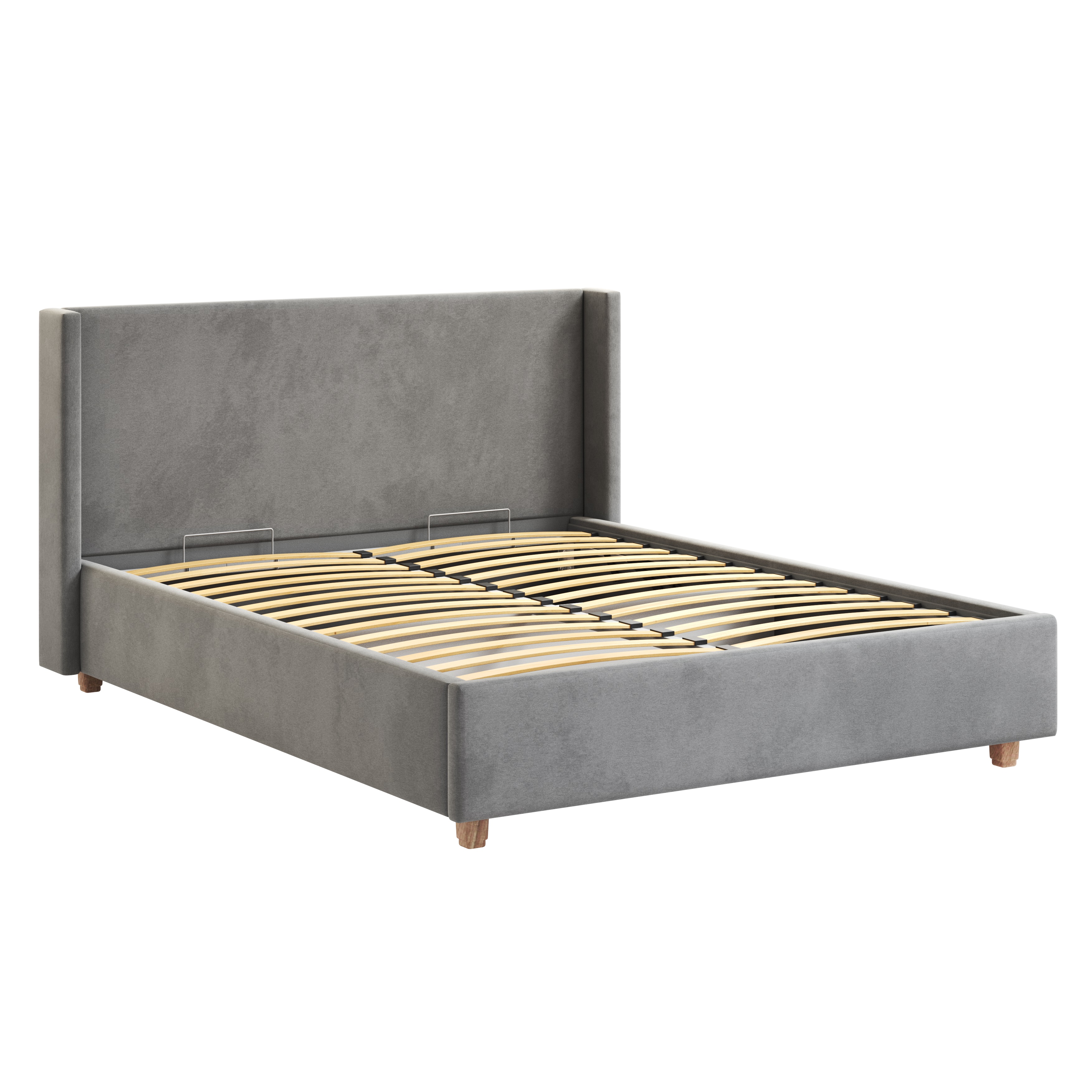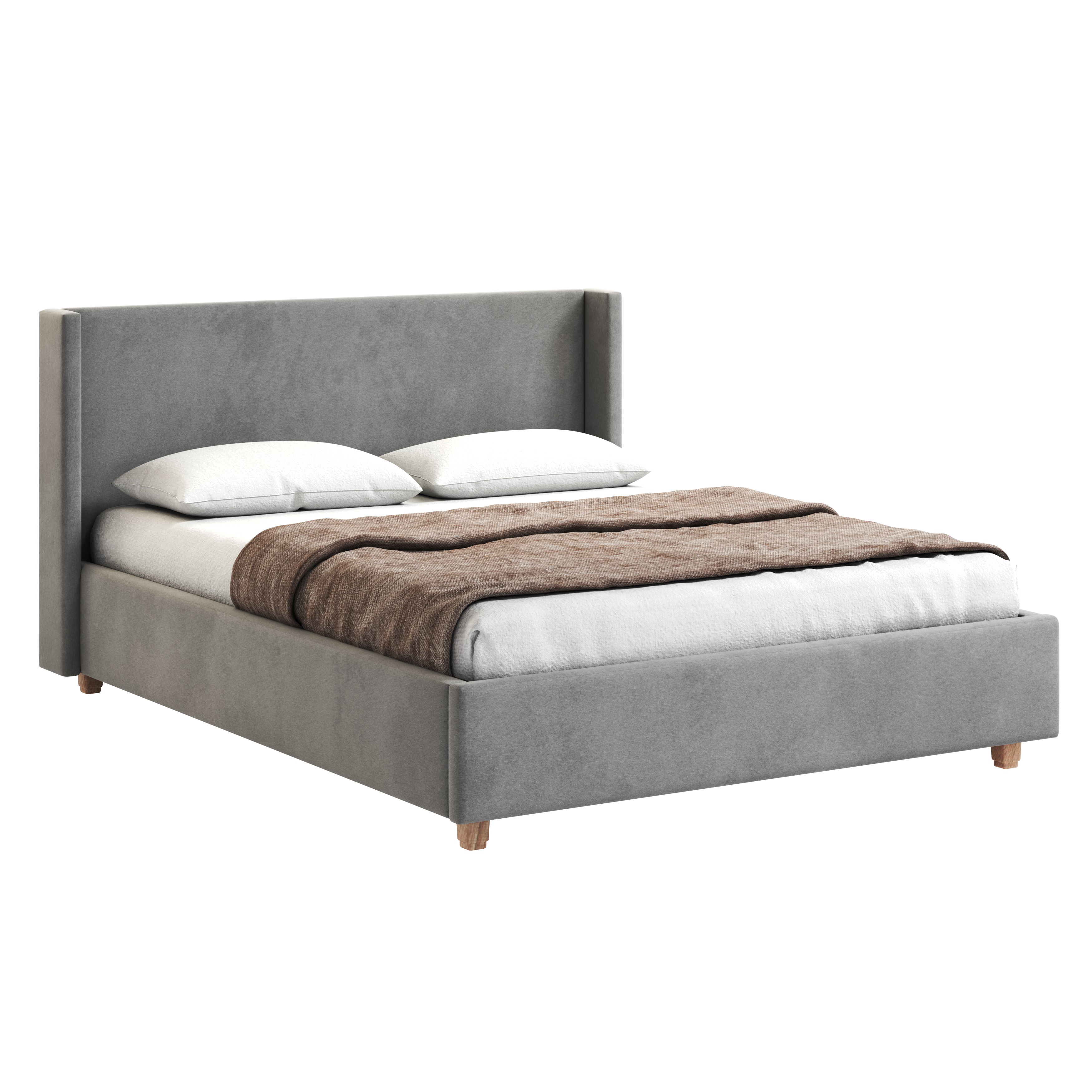 Кровать изготовлена из ЛДСП, что обеспечивает прочность и долговечность конструкции. Обивка из велюра искусственного светло-серого цвета придает кровати современный и стильный вид.