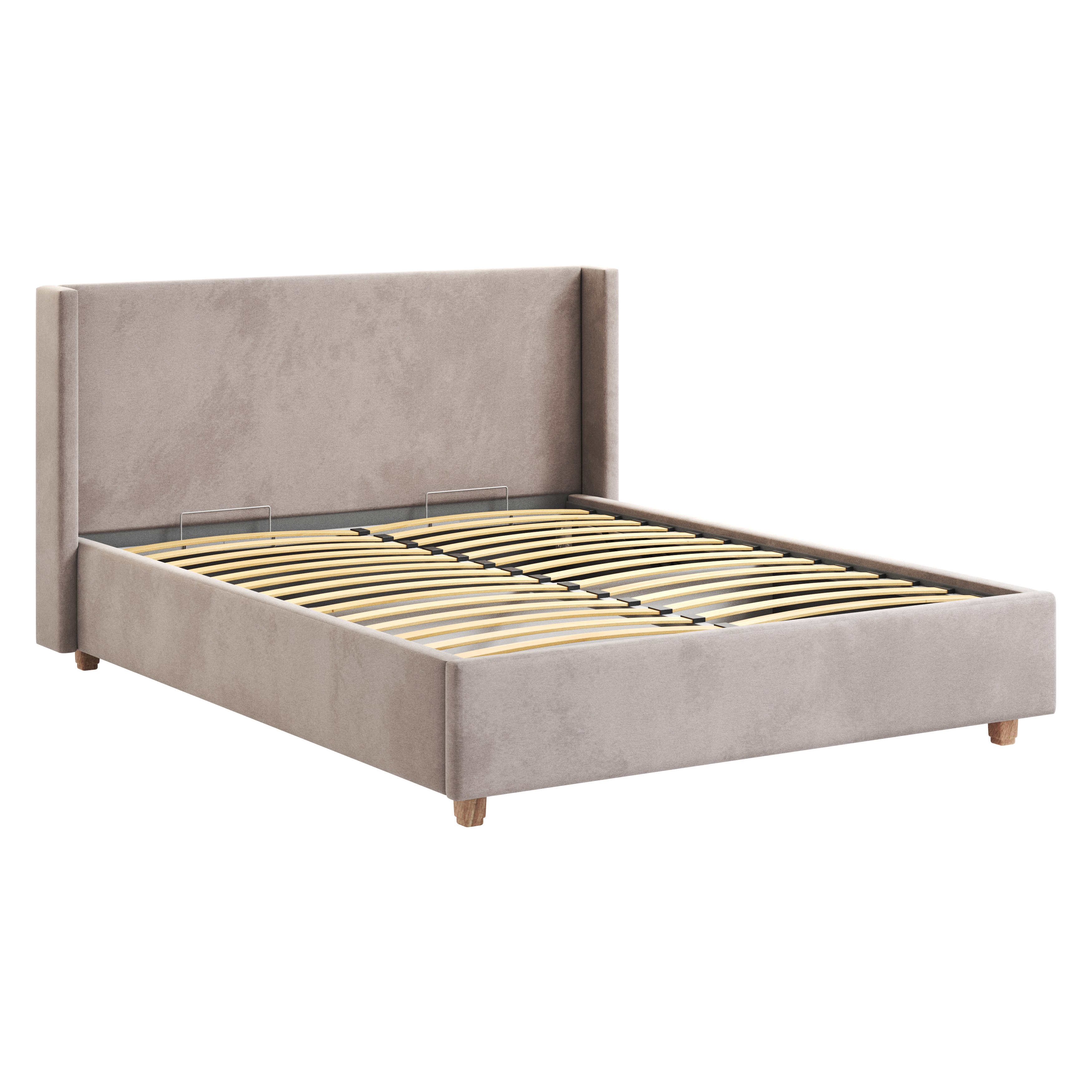 Кровать изготовлена из ЛДСП, что обеспечивает прочность и долговечность конструкции. Обивка из велюра искусственного светло-серого цвета придает кровати современный и стильный вид.