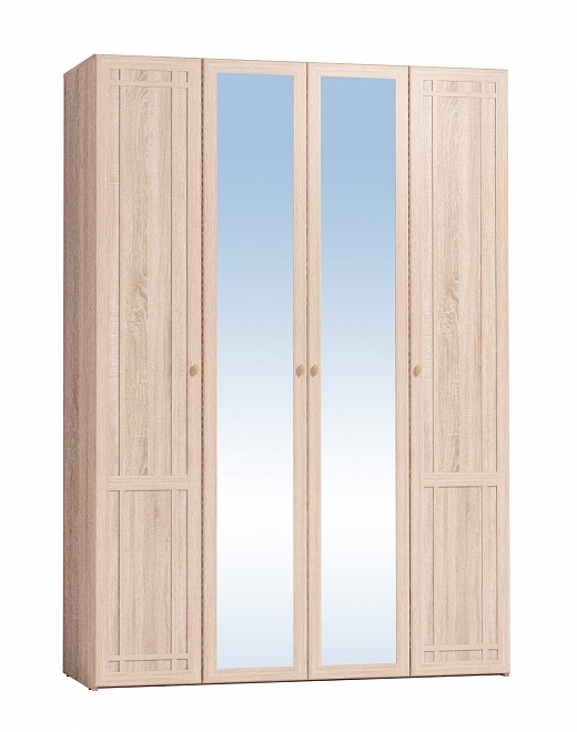 Организовать продуманное хранение вещей в спальне или гостиной поможет вместительный четырехдверный шкаф с разноплановым наполнением. По бокам шкаф комплектуется четырьмя полками, регулируемыми по высоте. В центральной части расположены две стационарные штанги, высоту которых также можно менять благодаря трем вариантам присадки. Глухие фасады модуля декорированы раскладкой, зеркальные - нет. Зеркальная часть визуально облегчает конструкцию шкафа и освежает интерьер. Данная модель - практичное решение, которое по функционалу и вместимости является прекрасной альтернативой шкафу-купе.