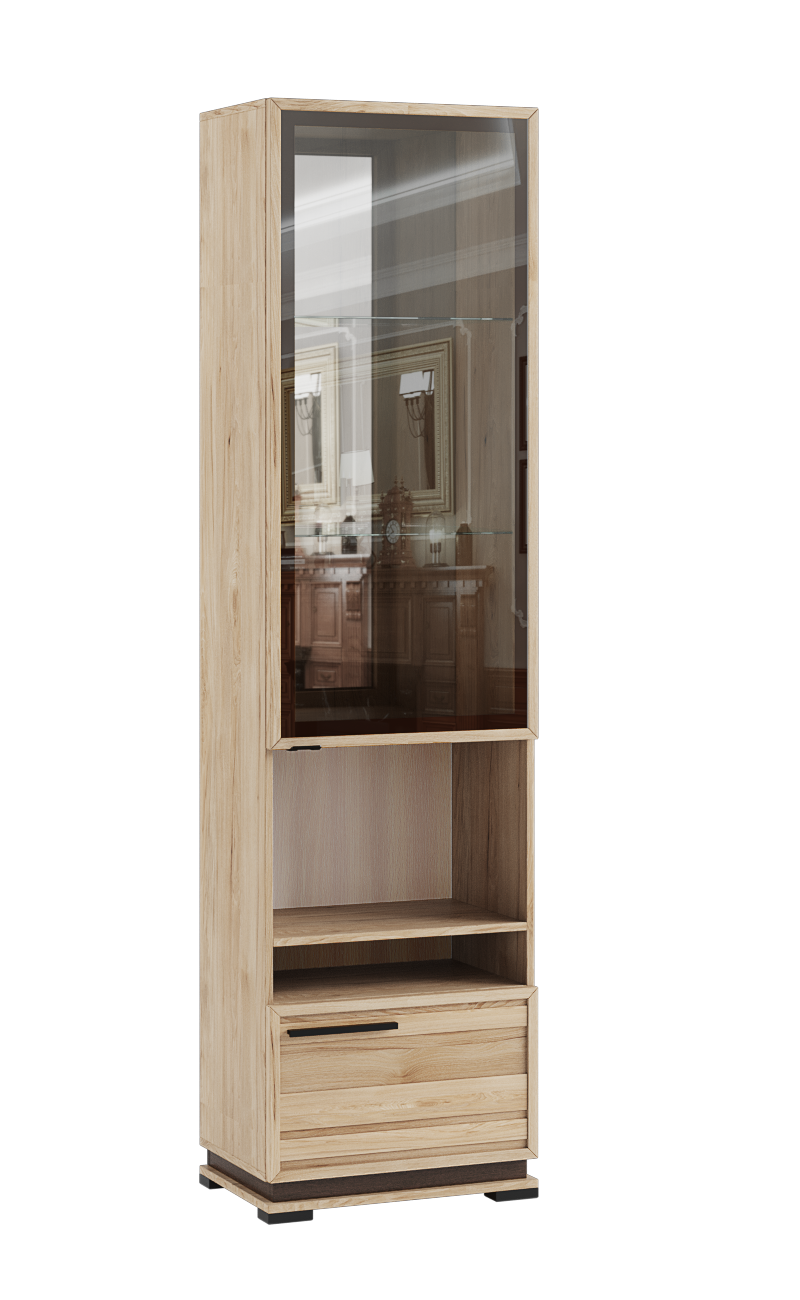 Пенал - незаменимый вид шкафа в любой гостиной. Шкаф-пеналМодена - отличный вариант для хранения книг и сервиза на закрытыхполках и в открытой секции. Прекрасно дополняет прочие модули коллекции и за счет своих габаритов вмещает большое количество предметов. Стеклянная дверца является несомненным украшением модуля и визуально облегчает интерьер. Нижняя дверца декорирована геометрическими вставками цвета ясень анкор светлый, что добавляет шкафу-пеналу стиля.