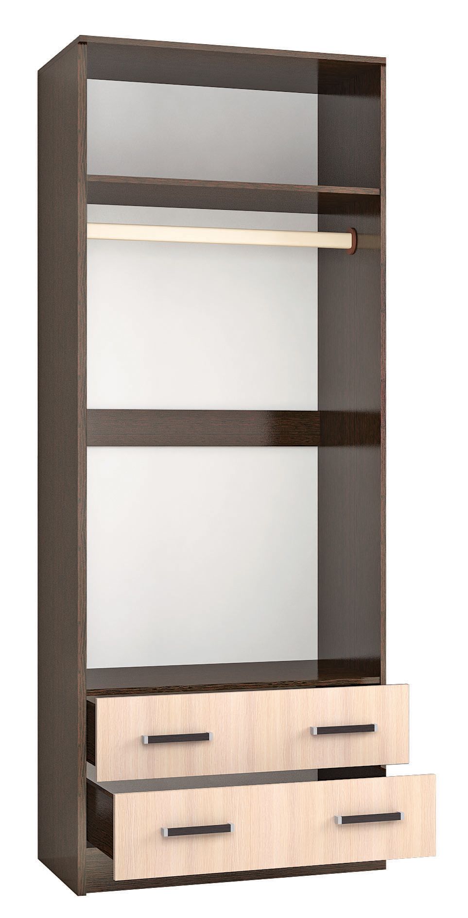 Комбинированный шкаф Лагуна впишется в любую обстановку, от современного интерьера прихожей до миниматистичной спальни. Шкаф оснащен выдвижными ящиками, штангой для одежды и полкой для вещей в коробках.