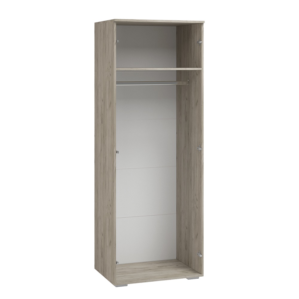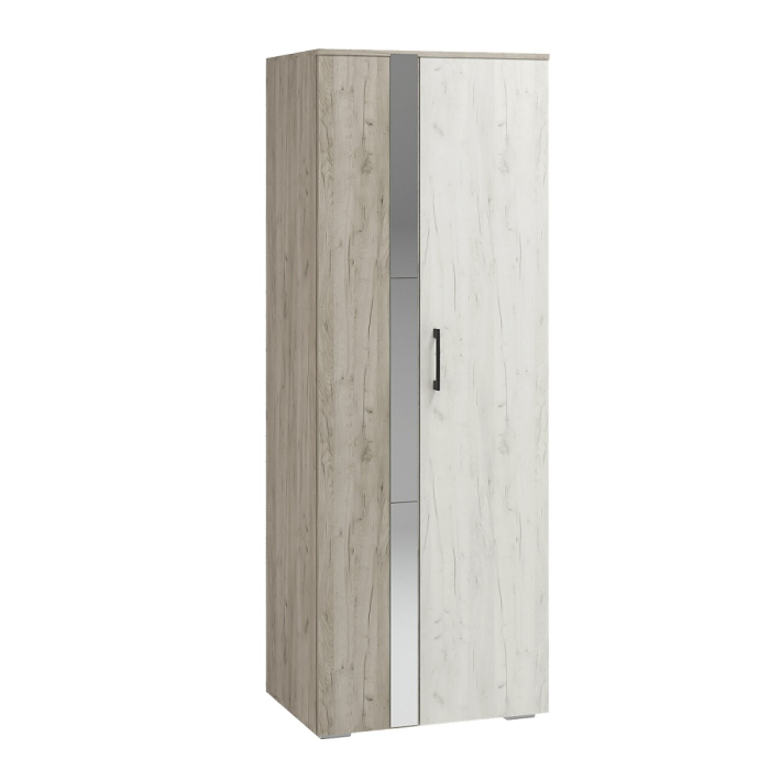 Двустворчатый шкаф для размещения одежды на горизонтальной штанге. Выполнен из ЛДСП в сочетании двух теплых древесных декоров, дуб крафт белый и дуб крафт серый.