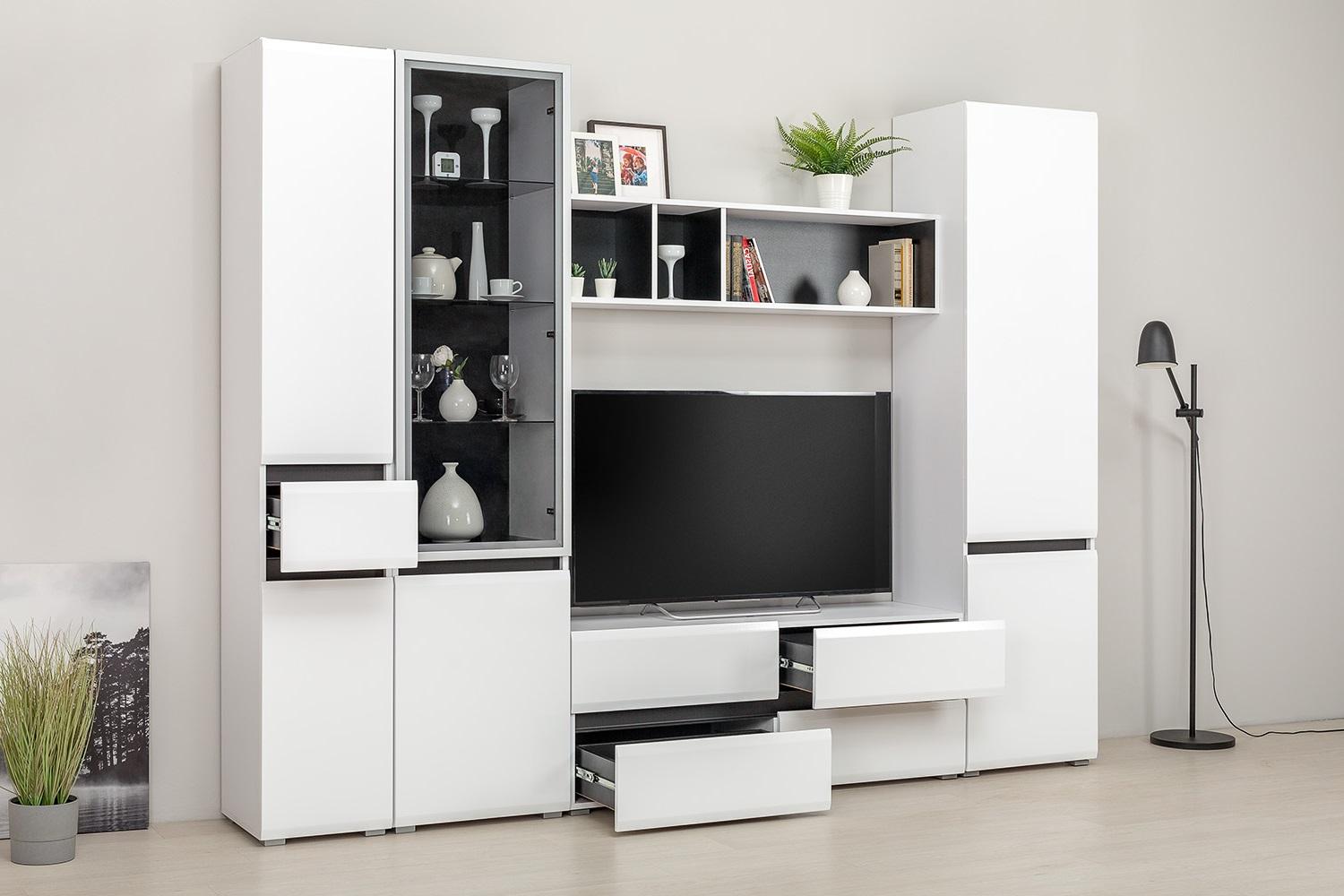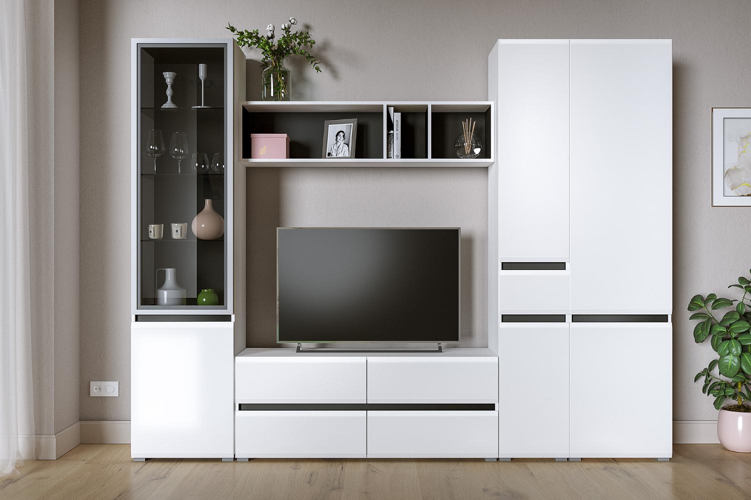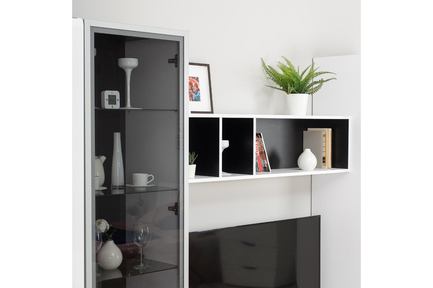 Шкаф-витрина Сидней 13.201 — это идеальное сочетание стиля, функциональности и качества. Белый глянцевый фасад придаёт помещению современный вид, а чёрная горизонтальная вставка и задняя стенка добавляют элегантности.