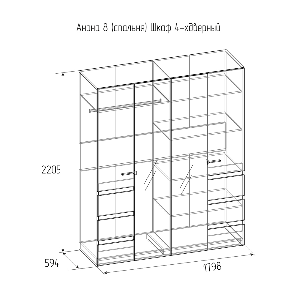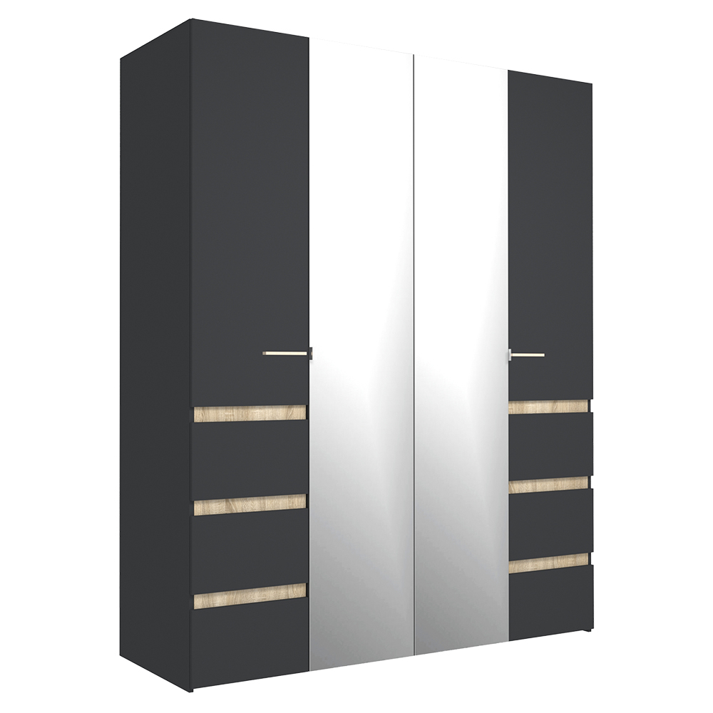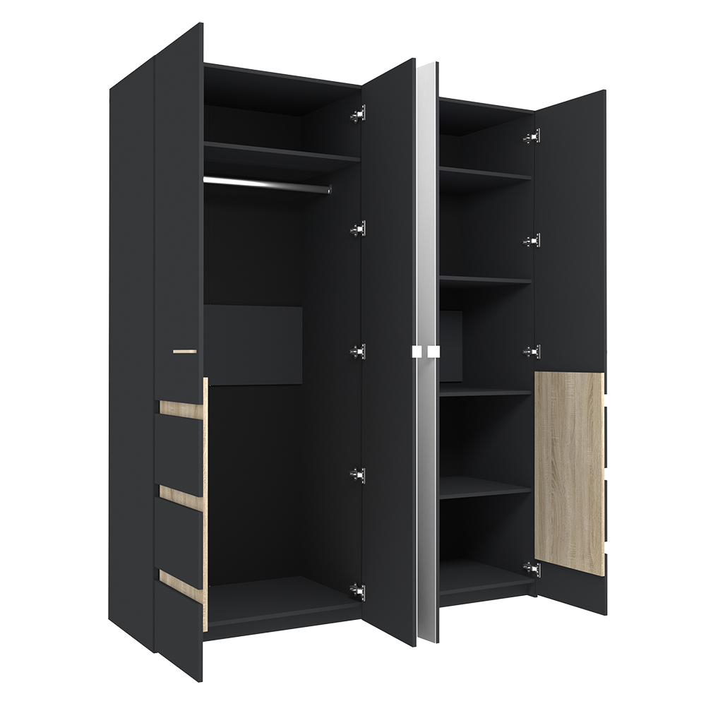 Шкаф распашной четырёхдневный с декоративными вставками дуб сонома. Особенно эффектно смотрится двери с зеркалами в сочетании с цветом антрацит. За фасадами вы найдете отсек с хромированной штангой и антресолью и секцию с полками.