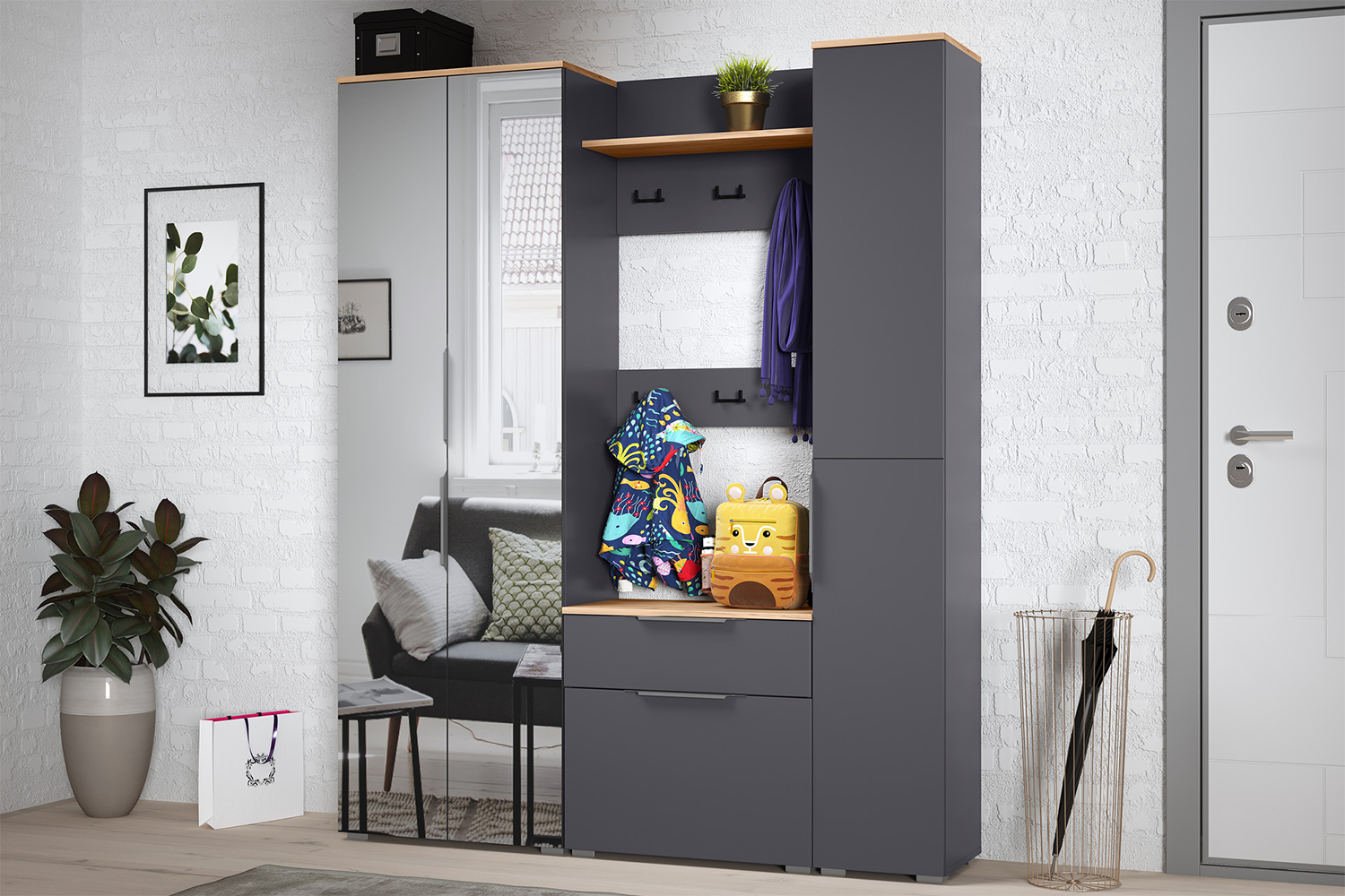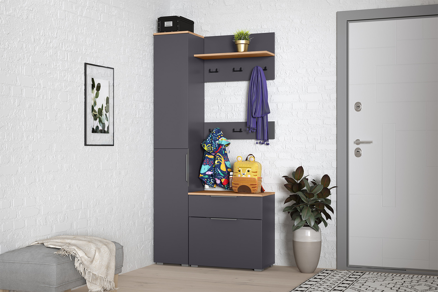 Внутреннее наполнение включает полки для хранения одежды, обуви и других вещей.