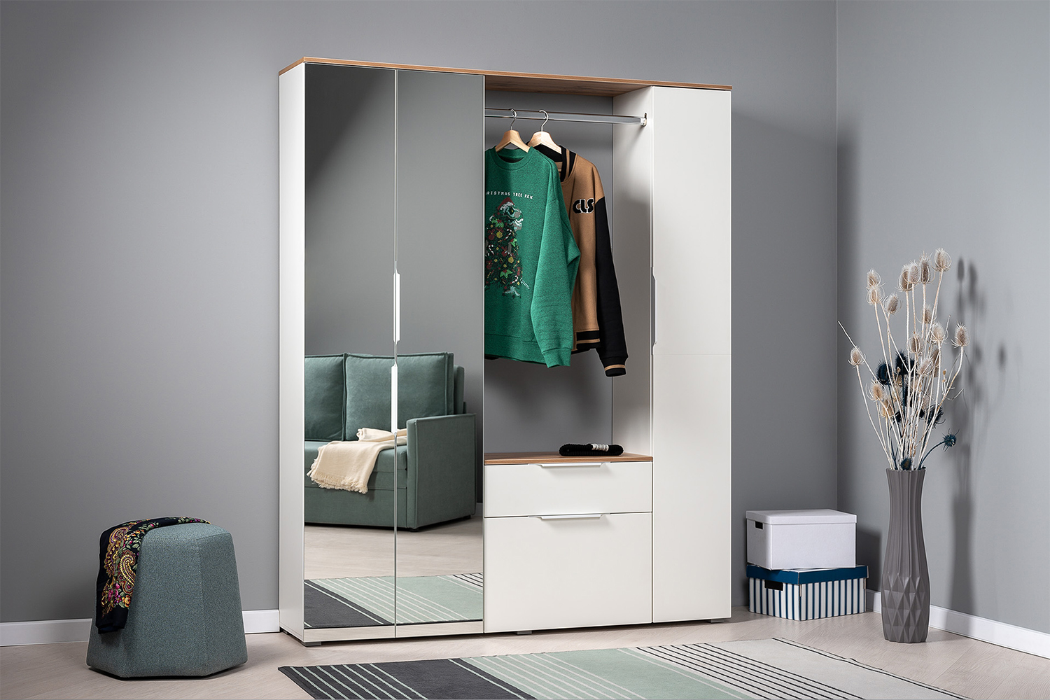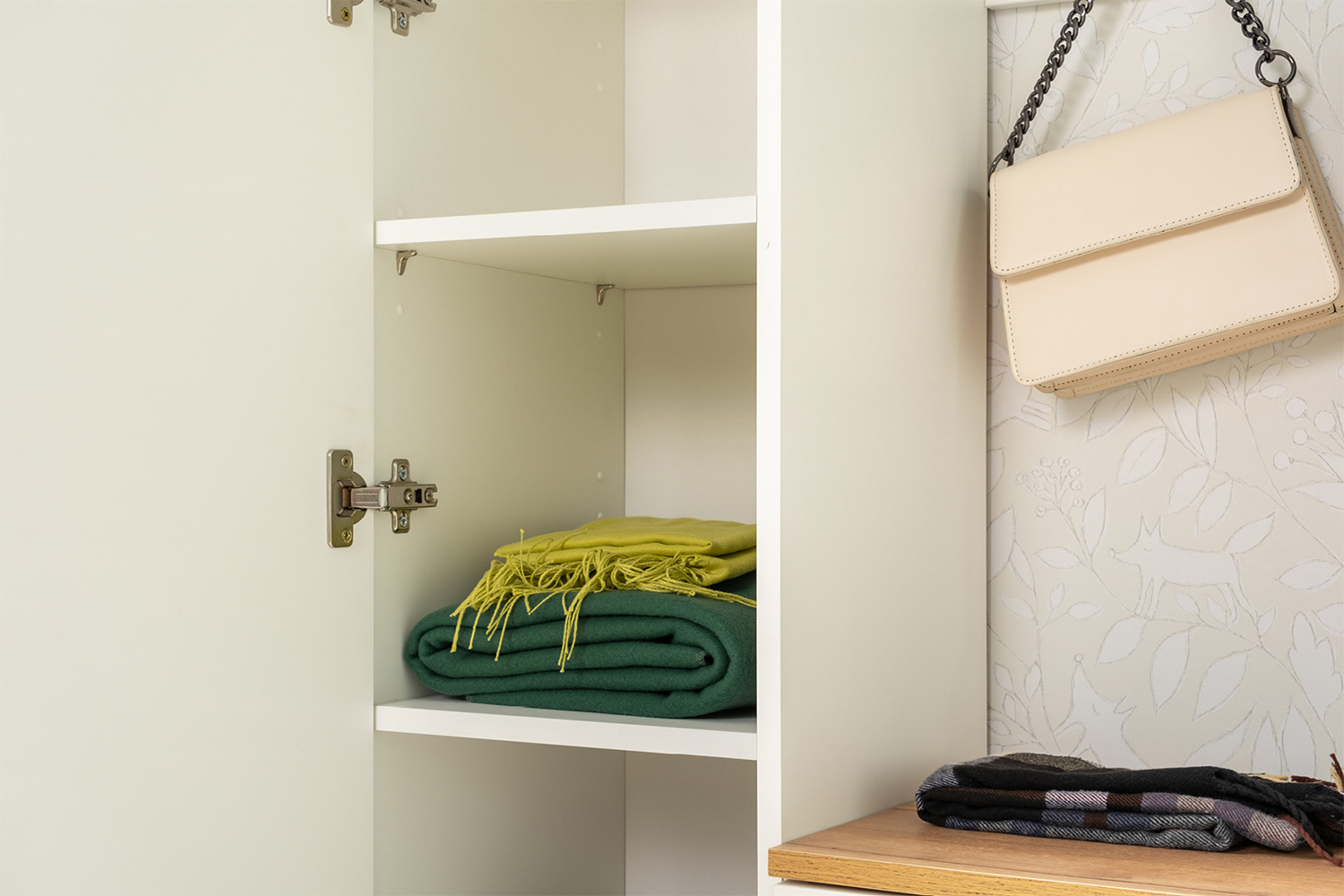 Внутреннее наполнение включает полки для хранения одежды, обуви и других вещей.