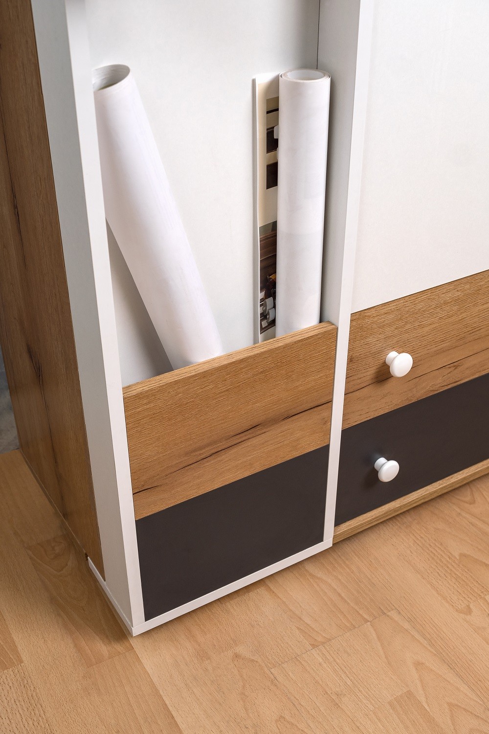 Часто увлечения и хобби ребенка перерастает в дело всей жизни. Выдвижной шкаф МЦН имеет две зоны хранения: закрытую зону и открытую с карманами. Наполнение шкафа, комплект полок с ограничителями и ниша с крючками, идеально подойдет для хранения вещей в сложенном виде. Канцелярские предметы, книги и предметы декора Вы сможете расположить на самом фасаде.