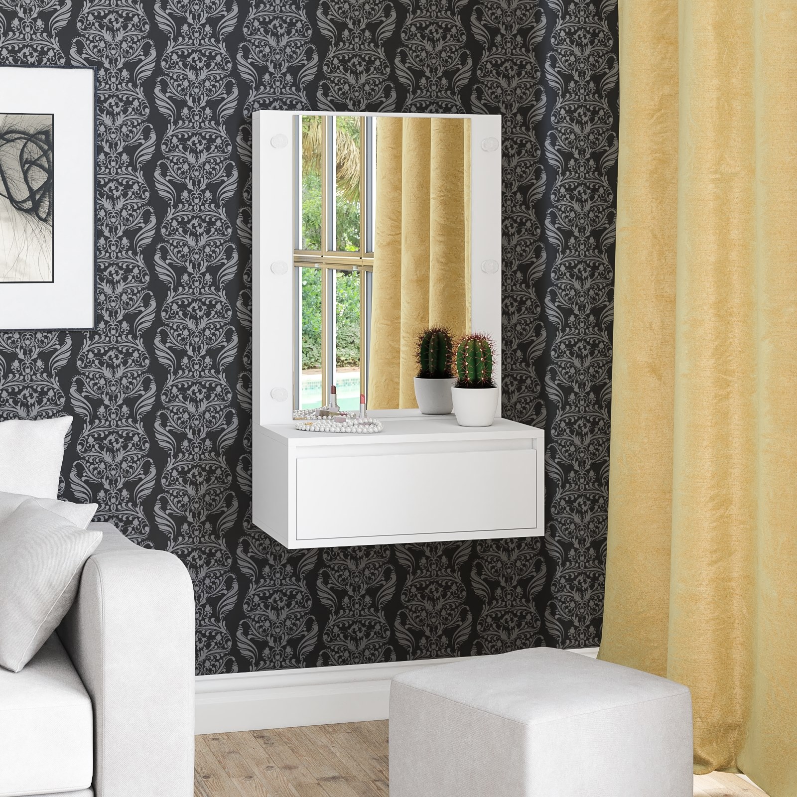 Столик крепится к стене, что позволяет установить его на любой удобной для вас высоте, обеспечивая максимальное удобство использования. Модель включает панель с зеркалом, которое создаёт эффект простора и яркости в помещении. Под столешницей расположен вместительный выдвижной ящик на шариковых направляющих, в котором удобно хранить косметику, аксессуары и другие нужные мелочи, сохраняя порядок на рабочей поверхности. Особенностью этого косметического стола являются отверстия для установки подсветки – по три с каждой стороны от зеркала. Это позволяет легко организовать равномерное освещение лица, что особенно важно при нанесении макияжа или выполнении уходовых процедур.