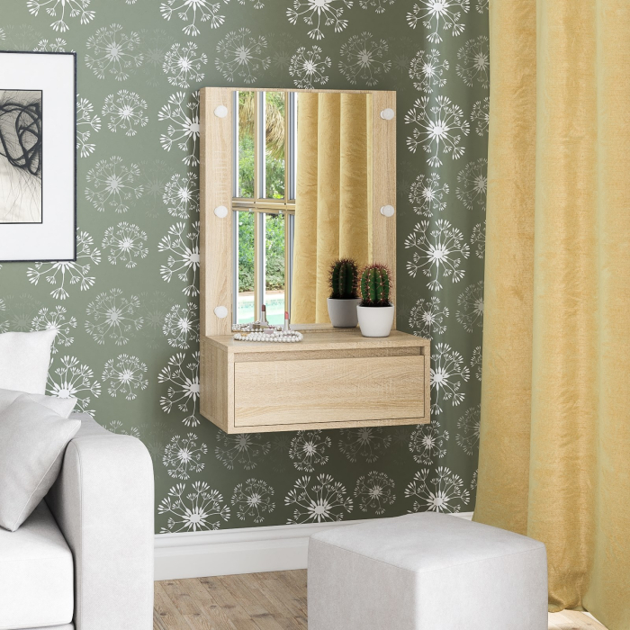 Столик крепится к стене, что позволяет установить его на любой удобной для вас высоте, обеспечивая максимальное удобство использования. Модель включает панель с зеркалом, которое создаёт эффект простора и яркости в помещении. Под столешницей расположен вместительный выдвижной ящик на шариковых направляющих, в котором удобно хранить косметику, аксессуары и другие нужные мелочи, сохраняя порядок на рабочей поверхности. Особенностью этого косметического стола являются отверстия для установки подсветки – по три с каждой стороны от зеркала. Это позволяет легко организовать равномерное освещение лица, что особенно важно при нанесении макияжа или выполнении уходовых процедур.