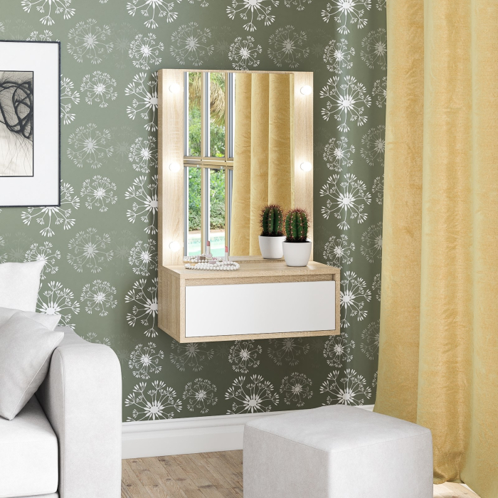 Столик крепится к стене, что позволяет установить его на любой удобной для вас высоте, обеспечивая максимальное удобство использования. Модель включает панель с зеркалом, которое создаёт эффект простора и яркости в помещении. Под столешницей расположен вместительный выдвижной ящик на шариковых направляющих, в котором удобно хранить косметику, аксессуары и другие нужные мелочи, сохраняя порядок на рабочей поверхности. Особенностью этого косметического стола являются отверстия для установки подсветки – по три с каждой стороны от зеркала. Это позволяет легко организовать равномерное освещение лица, что особенно важно при нанесении макияжа или выполнении уходовых процедур.