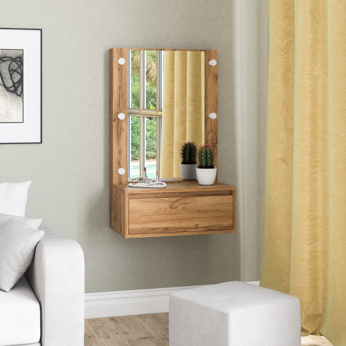 Столик крепится к стене, что позволяет установить его на любой удобной для вас высоте, обеспечивая максимальное удобство использования. Модель включает панель с зеркалом, которое создаёт эффект простора и яркости в помещении. Под столешницей расположен вместительный выдвижной ящик на шариковых направляющих, в котором удобно хранить косметику, аксессуары и другие нужные мелочи, сохраняя порядок на рабочей поверхности. Особенностью этого косметического стола являются отверстия для установки подсветки – по три с каждой стороны от зеркала. Это позволяет легко организовать равномерное освещение лица, что особенно важно при нанесении макияжа или выполнении уходовых процедур.