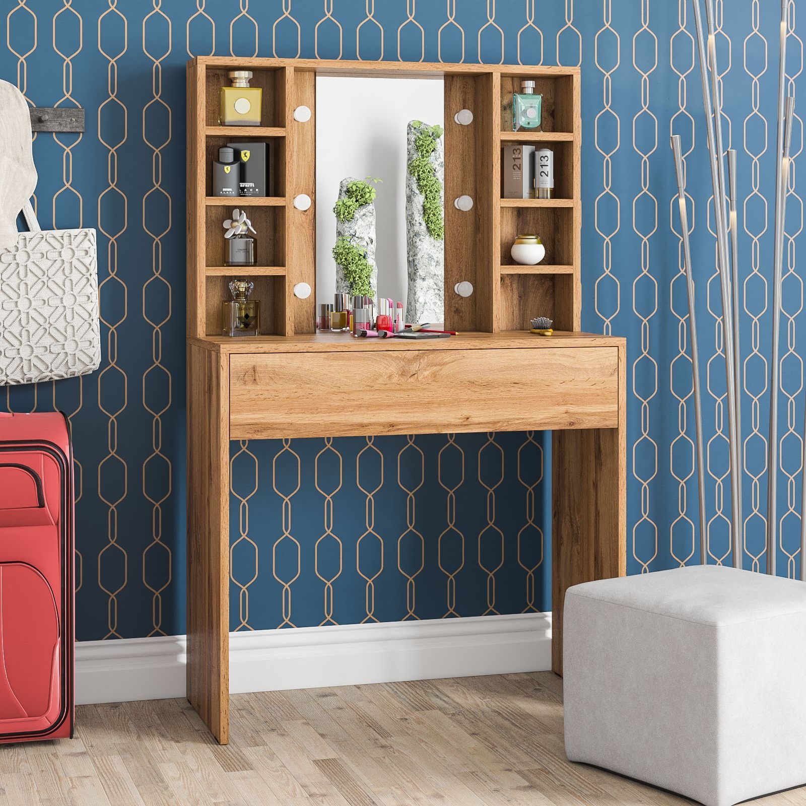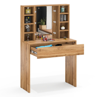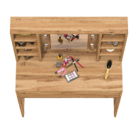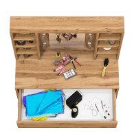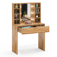 Зеркало расположено в центре композиции, создавая фокусную точку, которая привлекает внимание и помогает сделать утренние и вечерние бьюти-ритуалы более удобными. По бокам от зеркала расположены стойки с тремя аккуратными полочками с каждой стороны. Эти полочки предоставляют достаточно места для хранения косметики, парфюмерии и декоративных элементов. Благодаря продуманному расположению полочек, все необходимые аксессуары всегда будут под рукой, что добавляет удобства в использовании. Под столешницей размещен вместительный выдвижной ящик, который позволяет организовать пространство для хранения косметики, аксессуаров и других мелочей. Ящик на шариковых направляющих выдвигается плавно и бесшумно, обеспечивая лёгкий доступ ко всем необходимым предметам. Особенностью косметического стола являются отверстия для установки подсветки – по три с каждой стороны от зеркала. Это даёт возможность создать яркое и равномерное освещение, которое особенно важно при нанесении макияжа.