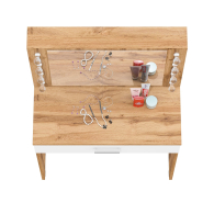 Зеркало расположено в центре композиции, создавая фокусную точку, которая привлекает внимание и помогает сделать утренние и вечерние бьюти-ритуалы более удобными. Под столешницей размещен вместительный выдвижной ящик, который позволяет организовать пространство для хранения косметики, аксессуаров и других мелочей. Ящик на роликовых направляющих выдвигается плавно и бесшумно, обеспечивая лёгкий доступ ко всем необходимым предметам. Особенностью косметического стола являются отверстия для установки подсветки – по три с каждой стороны от зеркала. Это даёт возможность создать яркое и равномерное освещение, которое особенно важно при нанесении макияжа.