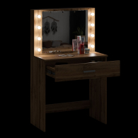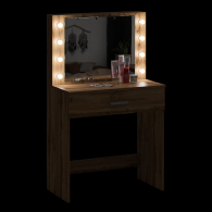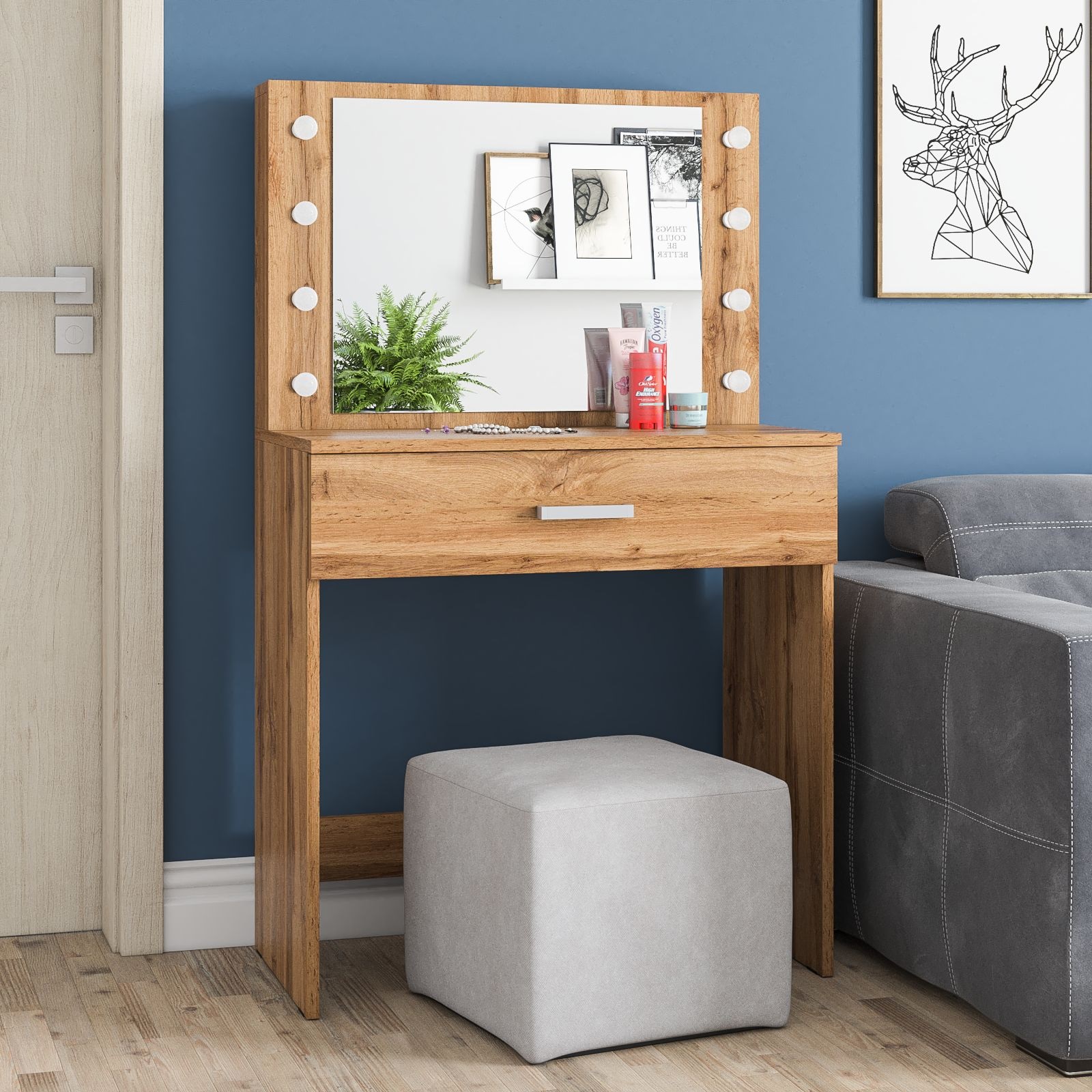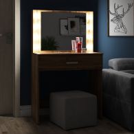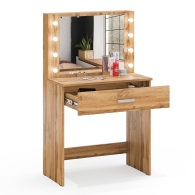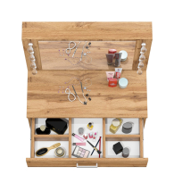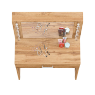 Зеркало расположено в центре композиции, создавая фокусную точку, которая привлекает внимание и помогает сделать утренние и вечерние бьюти-ритуалы более удобными. Под столешницей размещен вместительный выдвижной ящик, который позволяет организовать пространство для хранения косметики, аксессуаров и других мелочей. Ящик на роликовых направляющих выдвигается плавно и бесшумно, обеспечивая лёгкий доступ ко всем необходимым предметам. Особенностью косметического стола являются отверстия для установки подсветки – по три с каждой стороны от зеркала. Это даёт возможность создать яркое и равномерное освещение, которое особенно важно при нанесении макияжа.