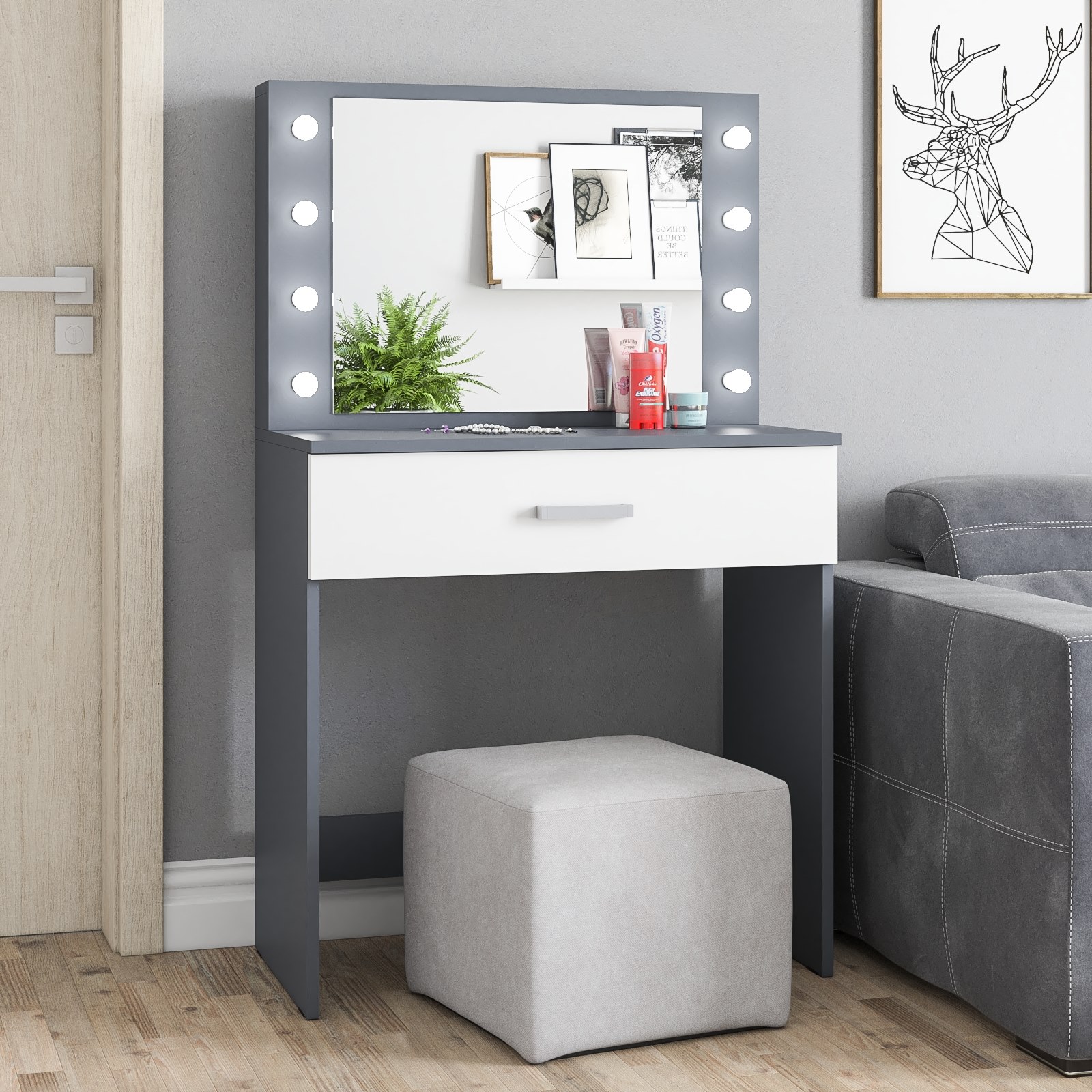 Зеркало расположено в центре композиции, создавая фокусную точку, которая привлекает внимание и помогает сделать утренние и вечерние бьюти-ритуалы более удобными. Под столешницей размещен вместительный выдвижной ящик, который позволяет организовать пространство для хранения косметики, аксессуаров и других мелочей. Ящик на роликовых направляющих выдвигается плавно и бесшумно, обеспечивая лёгкий доступ ко всем необходимым предметам. Особенностью косметического стола являются отверстия для установки подсветки – по три с каждой стороны от зеркала. Это даёт возможность создать яркое и равномерное освещение, которое особенно важно при нанесении макияжа.
