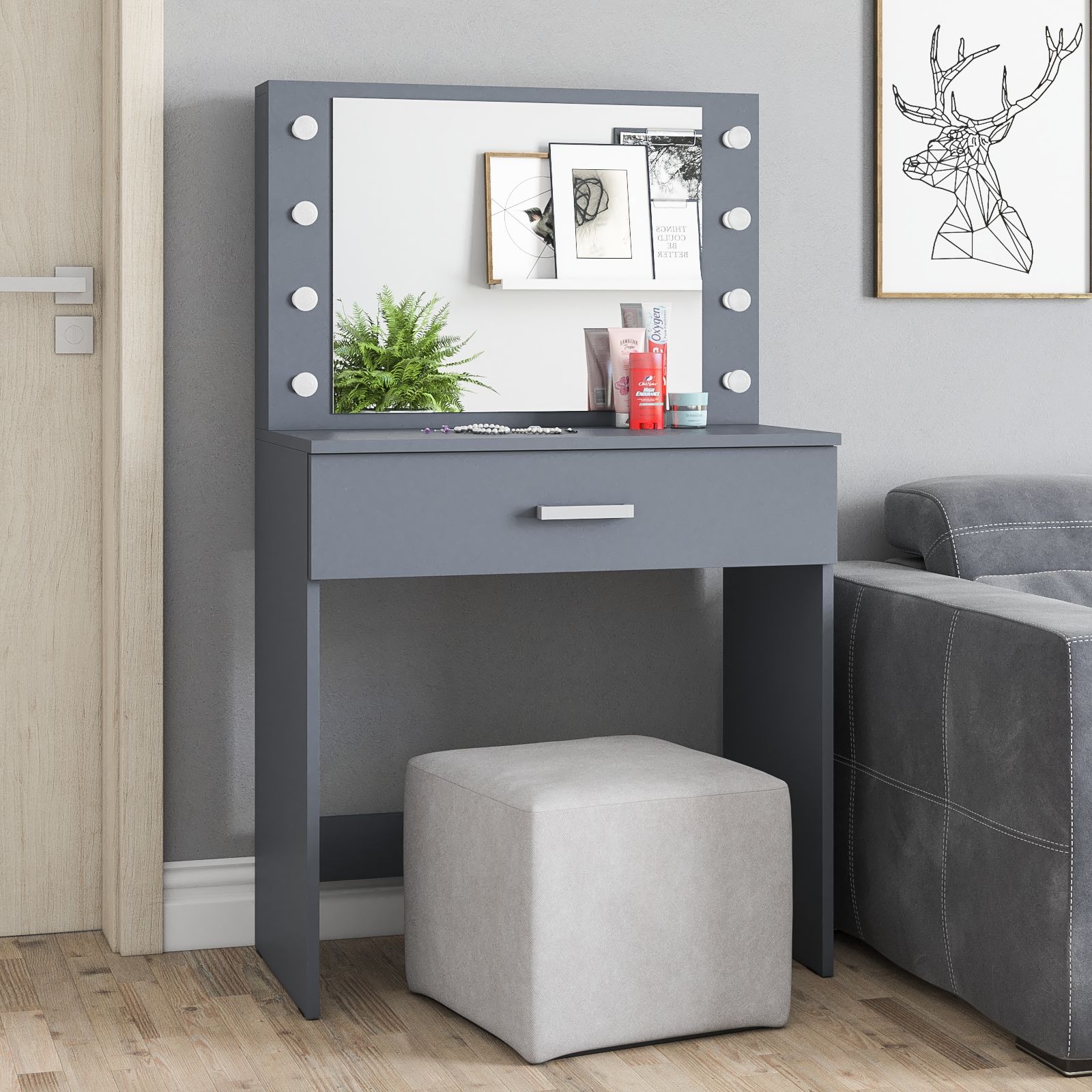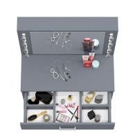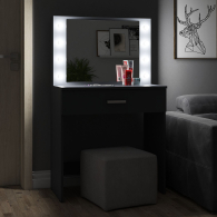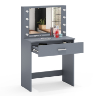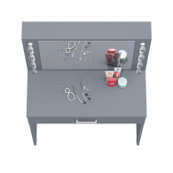 Зеркало расположено в центре композиции, создавая фокусную точку, которая привлекает внимание и помогает сделать утренние и вечерние бьюти-ритуалы более удобными. Под столешницей размещен вместительный выдвижной ящик, который позволяет организовать пространство для хранения косметики, аксессуаров и других мелочей. Ящик на роликовых направляющих выдвигается плавно и бесшумно, обеспечивая лёгкий доступ ко всем необходимым предметам. Особенностью косметического стола являются отверстия для установки подсветки – по три с каждой стороны от зеркала. Это даёт возможность создать яркое и равномерное освещение, которое особенно важно при нанесении макияжа.