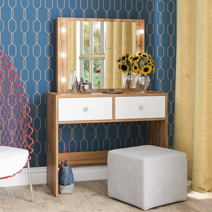 Под просторной столешницей расположены два выдвижных ящика на шариковых направляющих, которые обеспечивают плавное и бесшумное выдвижение. Ящики предлагают достаточно места для хранения косметики, аксессуаров и других мелочей. Благодаря этому все необходимые предметы будут аккуратно организованы и всегда под рукой.