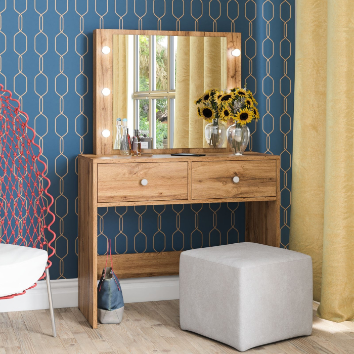 Под просторной столешницей расположены два выдвижных ящика на шариковых направляющих, которые обеспечивают плавное и бесшумное выдвижение. Ящики предлагают достаточно места для хранения косметики, аксессуаров и других мелочей. Благодаря этому все необходимые предметы будут аккуратно организованы и всегда под рукой.