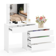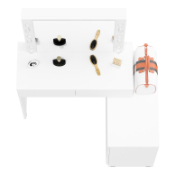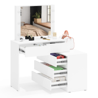 Под просторной столешницей расположены два выдвижных ящика, которые плавно и бесшумно выдвигаются, обеспечивая легкий доступ к косметике и аксессуарам. Дополнительное пространство для хранения предоставляет вместительная тумба с тремя широкими ящиками, расположенная с одной стороны столика.